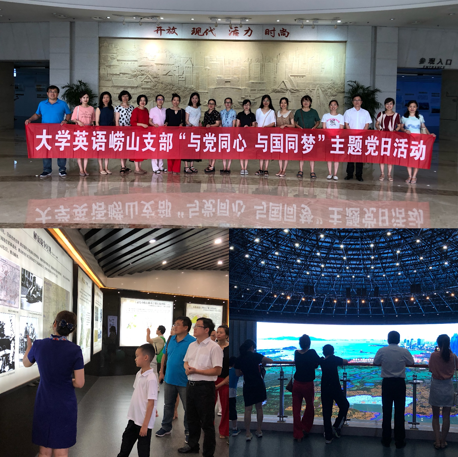 7月18日上午,大学英语崂山支部全体党员前往青岛规划展览馆进行主题党日活动。规划馆讲解员以城市规划编制为脉络,带我们走进青岛的前世今生,向大家展示了青岛的城市空间格局演变、新一轮城市空间发展战略和城市总体规划及各层次规划编制成果。随后,大家在中间大厅的巨型城市微缩模型前,收看了一场声光电配合的4D青岛规划变迁史;在360°全景影院中观赏了青岛市的相关影片,大气磅礴的宽阔影像让大家有身临其境的感受,对青岛的自然风貌、城市规划等有了更直观的感触。党员们深深感受到了党的领导下青岛城市发展的大格局,为自己工作生活的这座城市倍感自豪。