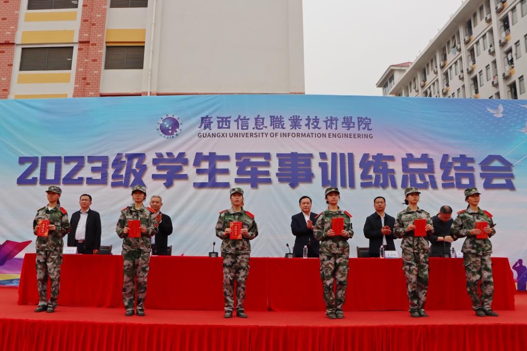 王兴辉校长在讲话中表示,两周的军训时光,同学们经风雨、磨意志,以昂扬的斗志和饱满的精神状态投入其中,磨砺了意志与品格、收获了独立与坚强、享受了快乐与成长。他对同学们提出了四点希望。一是发扬军队优良传统,保持军训优良作风。要在今后学习生活中,继承和发扬人民军队的优良传统,秉持严谨的学习作风,以高标准、严要求、快节奏的状态投入到专业知识学习之中。要厚植爱国主义情怀,传承民族精神基因,将青春礼赞融入到党和国家的伟大事业建设之中。二是保持昂扬精神面貌,培养良好生活习惯。要继续发扬顽强拼搏、坚韧不拔的奋斗精神,保持吃苦耐劳、积极向上的生活作风,牢记强国有我、兴校有我的铮铮誓言,为国家富强、民族复兴、人民幸福、学校发展贡献时代力量。三是认真回味军训经历,迅速投入学习生活。要铭记军训心路历程,认真总结军训收获,珍惜当前的美好时光,进一步增强时间管理,自觉努力提高专业知识水平,积极从思想上、心态上、行动上做好调整,全面适应新学期的生活节奏,快速投入到紧张的学习中。四是提高团队协作意识,强化集体荣誉观念。要在学习和生活中,互相包容、团结协作、共同进步,积极主动参加兴趣小组、群团组织和知识技能专业竞赛队伍,不断培养提高团队协作能力和组织凝聚力,努力争取优异的成绩,与广信职院一起不断成长。