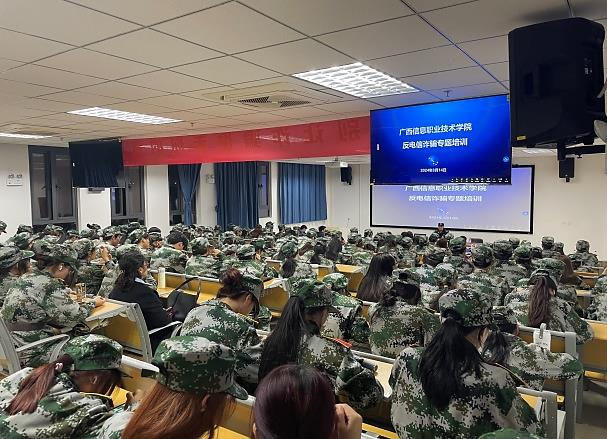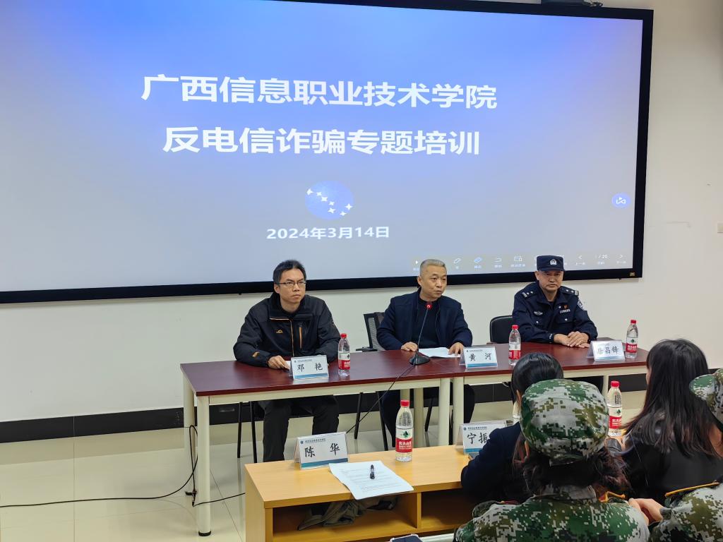 后勤与保卫处 陈华报道 3月14日晚,pg娱乐举办反电信诈骗与禁毒知识专题培训。学校副院长黄河,南宁市公安局龙岗派出所警官唐昌锋、中国移动邕宁分局局长宁振装等出席培训活动。学校各部门、二级学院的教职工、学生代表及物业相关人员共计200余人参加培训。培训由后勤与保卫处处长邓艳主持。