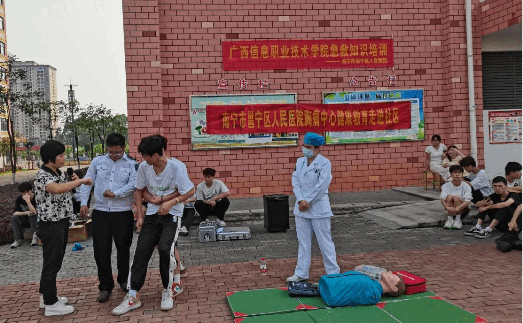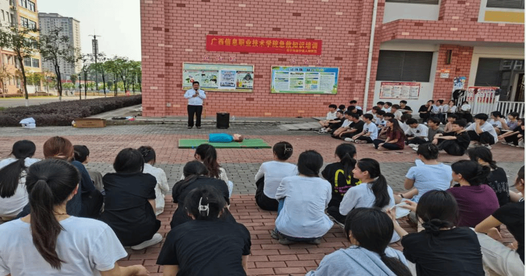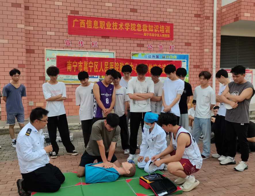 在急救专业知识培训中,南宁市邕宁区人民医院急诊科乃业顺医师、杨燕妹护师现场对师生们进行培训。乃业顺医师生动地讲解了心搏骤停、气道异物梗阻等常见突发事件现场急救方法和救护基本要领,并现场进行了模拟演示。同时,他还对便携式除颤仪的抢救原理、操作步骤进行了详细讲解和现场演示。