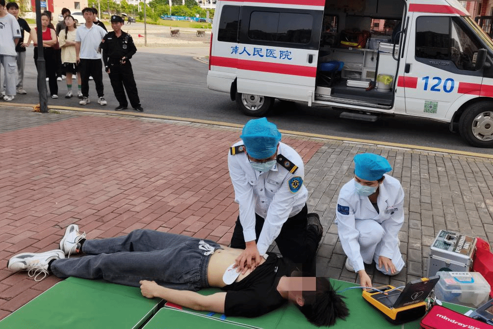 在演练活动中,现场模拟了学生突发晕倒的应急处置。下午四时,在2号学生宿舍楼前,1名学生突然在体育课上晕倒,周围同学立即报告体育老师。体育老师快速作出判断,发现患者意识不清、呼之不应、无颈动脉搏动和自主呼吸,立即对其进行心肺复苏,指导学生快速取回AED除颤仪,并通知学校医务室、辅导员、班主任,同时拨打120急救电话。上述人员接报后立刻展开系列紧急措施,在120急救人员到达前进行抢救。大约3分钟,120急救人员到达现场参与抢救。抢救成功后,相关人员将学生转运到医院进行进一步救治和检查。抢救过程中,校医务室人员根据工作职责,立即向部门负责人汇报,由部门负责人逐级上报突发情况及处置措施。