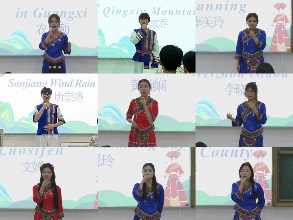 比赛现场,选手们尽显才华,各展神通。选手们或穿上民族服装,以激昂语调栩栩描绘广西的壮美景色;或以诱人笔触细腻介绍广西的地道美食;或以深邃目光娓娓讲述广西的文化底蕴。他们不仅展现了良好的英语口语能力,更以真挚情感打动了在场的每一位观众。选手唐崇盛还用他原创的英文歌曲“I will come back”,以音乐才华和对家乡的热爱,为比赛现场增添了一抹动人的色彩。