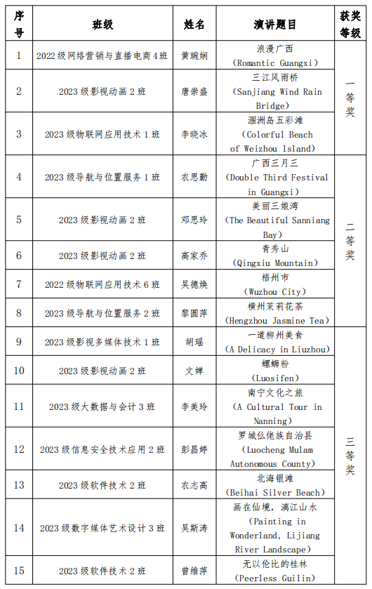 据了解,本次比赛的评委团由学校英语教研室团队组成。评委们一致认为,选手们的英语演讲表达流畅、内容丰富、情感真挚,充分展示了广西文化的魅力,为校园文化建设注入了新的活力,促进了不同学院、不同专业之间的交流融合,不失为学校课程思政实践领域的一次积极探索与尝试。
