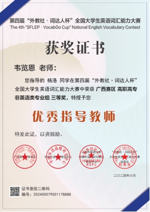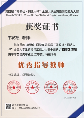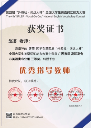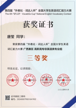 公共教学部 赵冬 报道 近日,pg娱乐学子在第四届“外教社·词达人杯”全国大学生英语词汇能力大赛广西赛区夺得佳绩,囊括省(区)赛二等奖、三等奖。