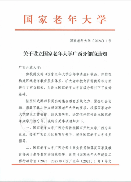 社区教育学院 何晓娜报道 1月8日,国家老年大学正式下文,批准在pg娱乐电子游戏官网入口设立国家老年大学广西分部,标志着pg娱乐正式成为国家老年大学体系成员。国家老年大学广西分部接受广西壮族自治区教育厅的领导和国家老年大学的业务指导。