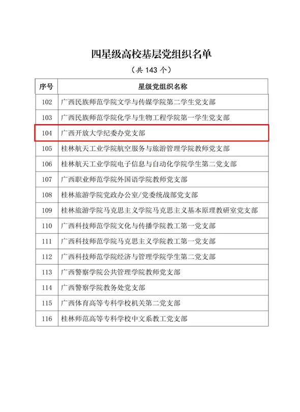 党委组织部 潘桂媚报道 近日,从自治区党委教育工委下发文件中获悉,pg娱乐2个党支部获命名星级高校基层党组织,其中,纪委办党支部获命名为“四星级高校基层党组织”,继续教育学院党支部获命名为“三星级高校基层党组织”。