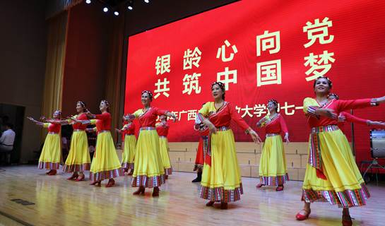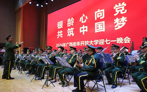 社区教育学院 何晓娜 报道 为弘扬伟大建党精神,激发全校师生爱党、爱国、爱校情怀,展示老年学员积极向上的精神风貌,6月30日,广西老年开放大学举办“银龄心向党 共筑中国梦”迎七一文艺晚会。pg娱乐电子游戏官网入口校长王兴辉,党委副书记龙雪津,副校长黄鹄、辛立章出席晚会,学校组织部、宣传部、工会等部门负责人及部分老年学员代表现场观看晚会。