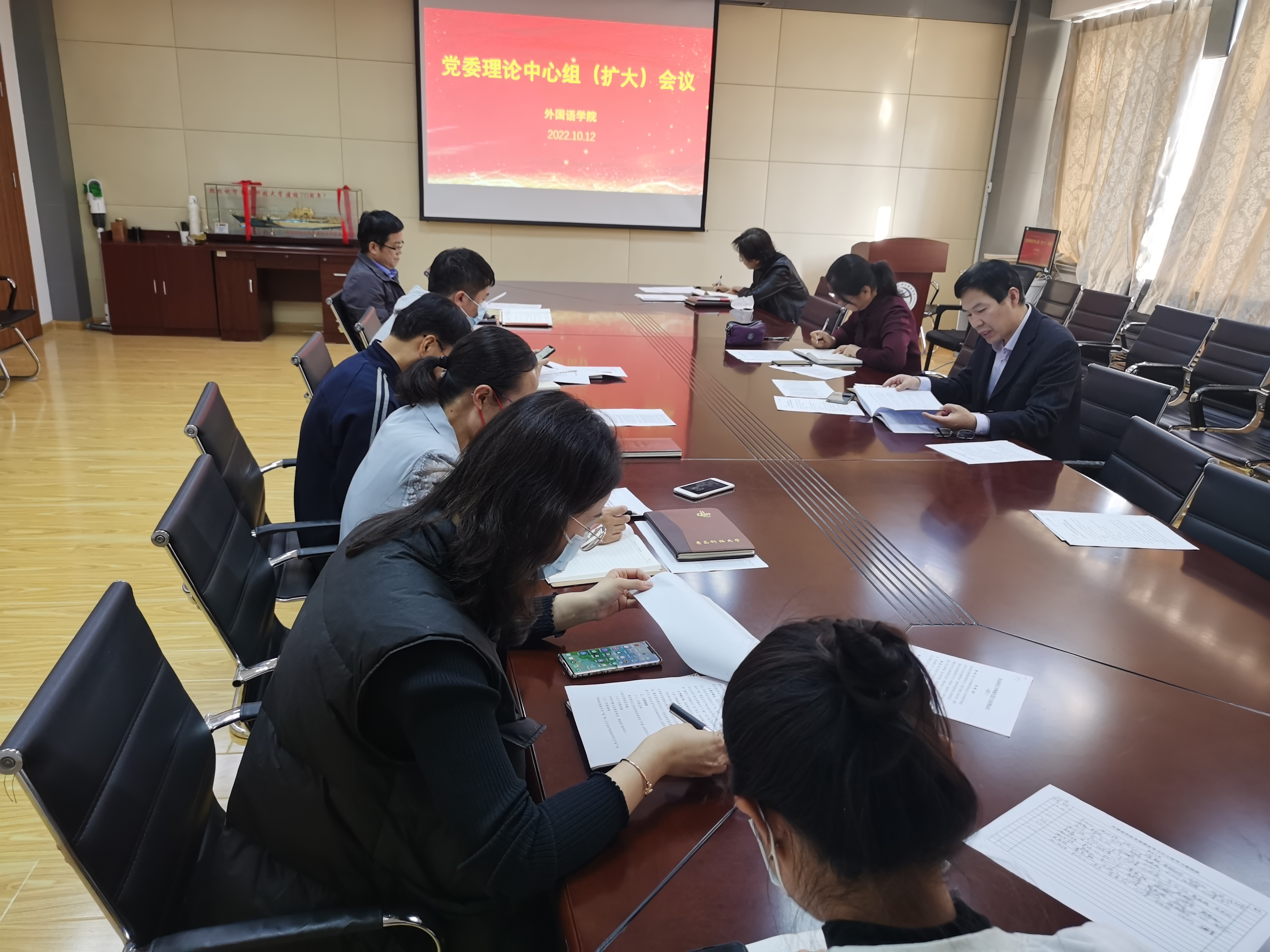 10月12日下午,beat365英国官方网站党委理论学习中心组(扩大)在学院517会议室举行集体学习,集体学习由学院党委书记曲斌艳主持,学院党委委员及政治辅导员参加。