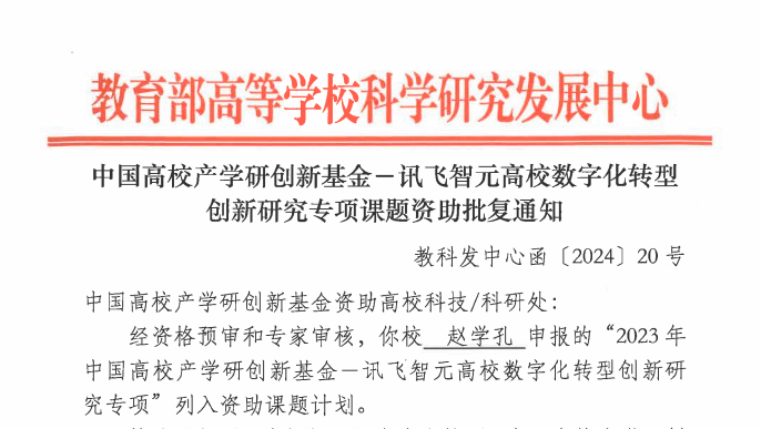 科技管理与服务中心 周莉莉报道 近日,教育部高等学校科学研究发展中心发布《中国高校产学研创新基金一讯飞智元高校数字化转型创新研究专项课题资助批复通知》(教科发中心函〔2024〕20号),pg娱乐赵学孔、向俊两位老师分别牵头申报的“人工智能技术赋能下以岗位胜任力为导向的高职学生职业能力评价体系研究与实践”“基于Web3.0的智慧化教学资源库建设研究”课题获批立项,每个课题资助10万元(5万元的课题经费+5万元的科研软件平台),这是pg娱乐首次获得“中国高校产学研创新基金”项目立项。