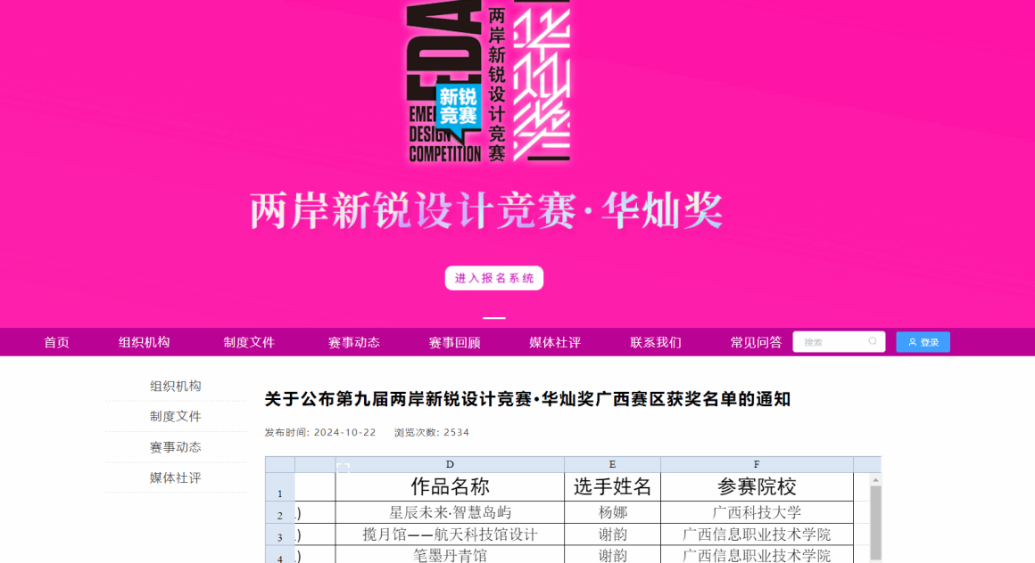 据悉,两岸新锐设计竞赛·华灿奖创办于2014年,属于B类赛事,每年举办一届,此项赛事有北京、上海、江苏、浙江、广西、广东、台湾香港和海外等31个赛区,参赛作品需要经过校级赛、赛区赛、全国总赛网络评审与现场评审,层层角逐,旨在促进两岸及港澳地区的文化交流与合作,推动设计产业的发展,培养和选拔优秀的青年设计人才。