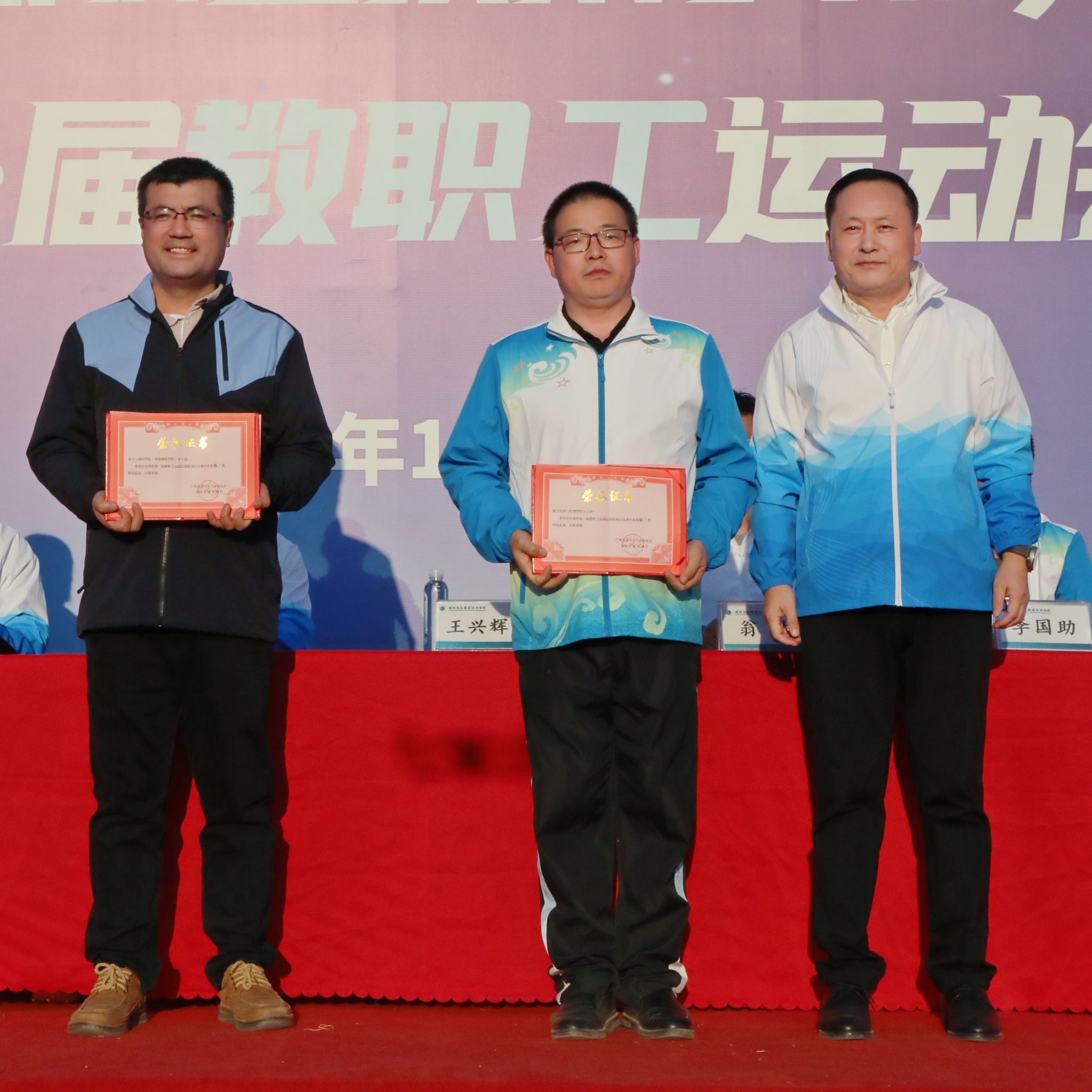 校长王兴辉为获得教职工团体总分第二名的数字经济与管理学院分工会、北斗与通信学院(智能制造学院)分工会教师代表颁奖