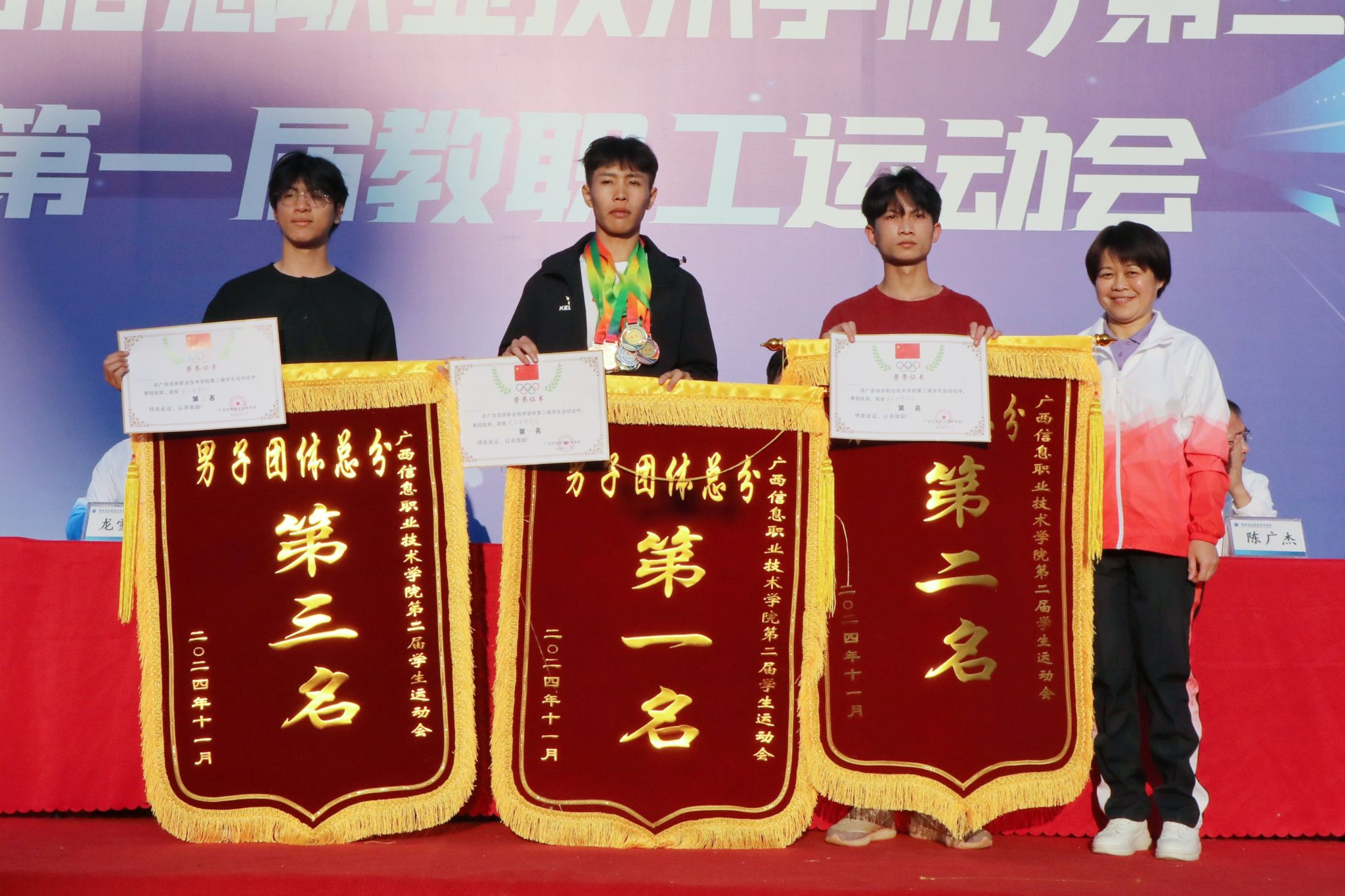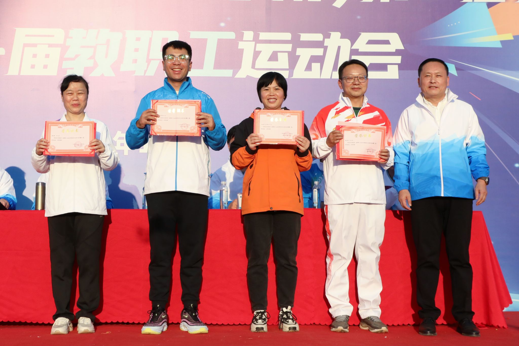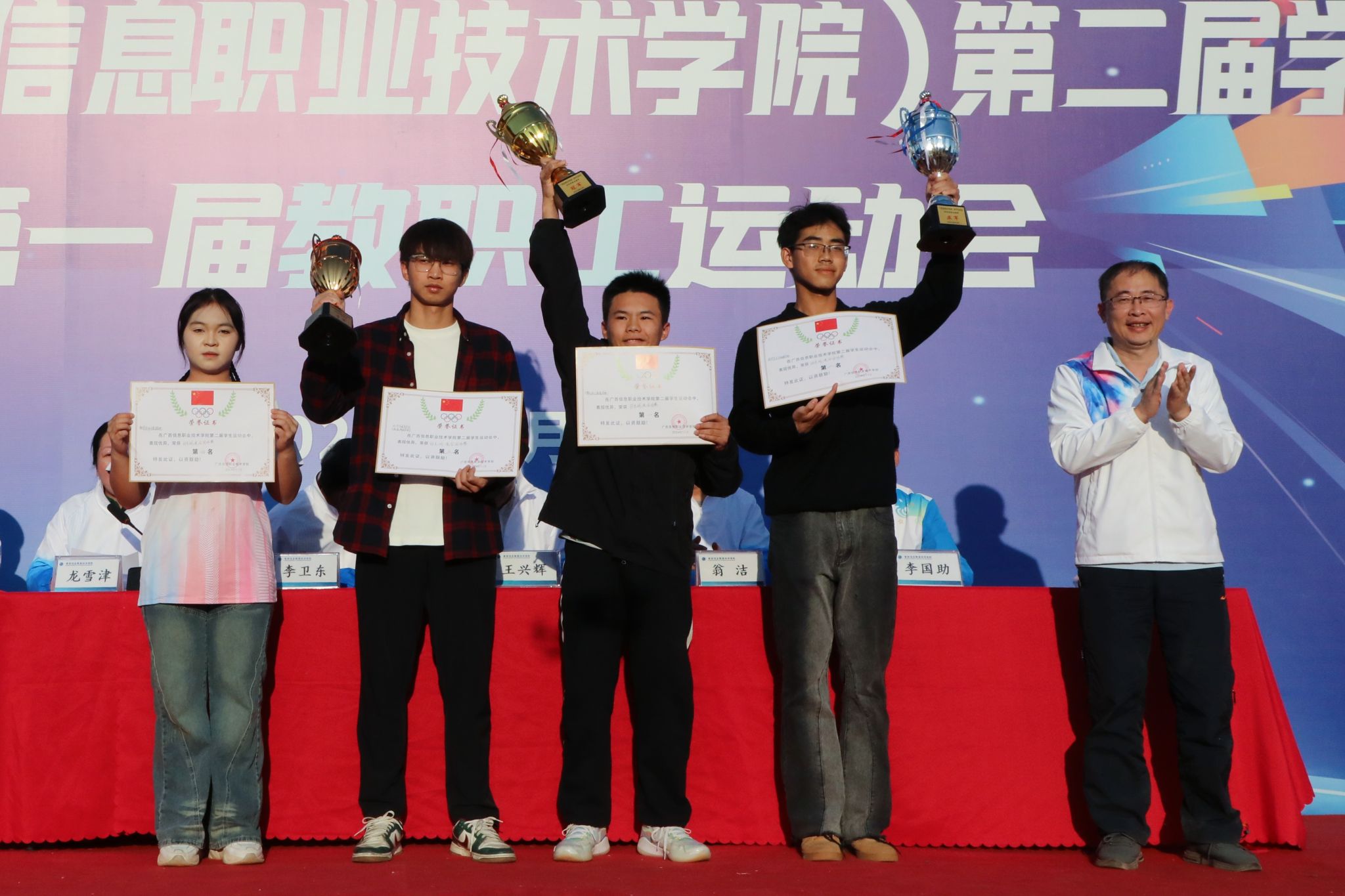 裁判长陈采铃宣读了比赛结果。数字经济与管理学院、数字艺术与传媒学院、北斗与通信学院(智能制造学院)分别获得团体总分的第一、二、三名。通识教育学院(国际教育学院、对外交流合作中心)分工会获得教职工团体总分第一名,数字经济与管理学院分工会、北斗与通信学院(智能制造学院)分工会获得教职工团体总分第二名,马克思主义学院分工会、机关第一分工会、机关第三分工会、机关第四分工会获得团体总分第三名。