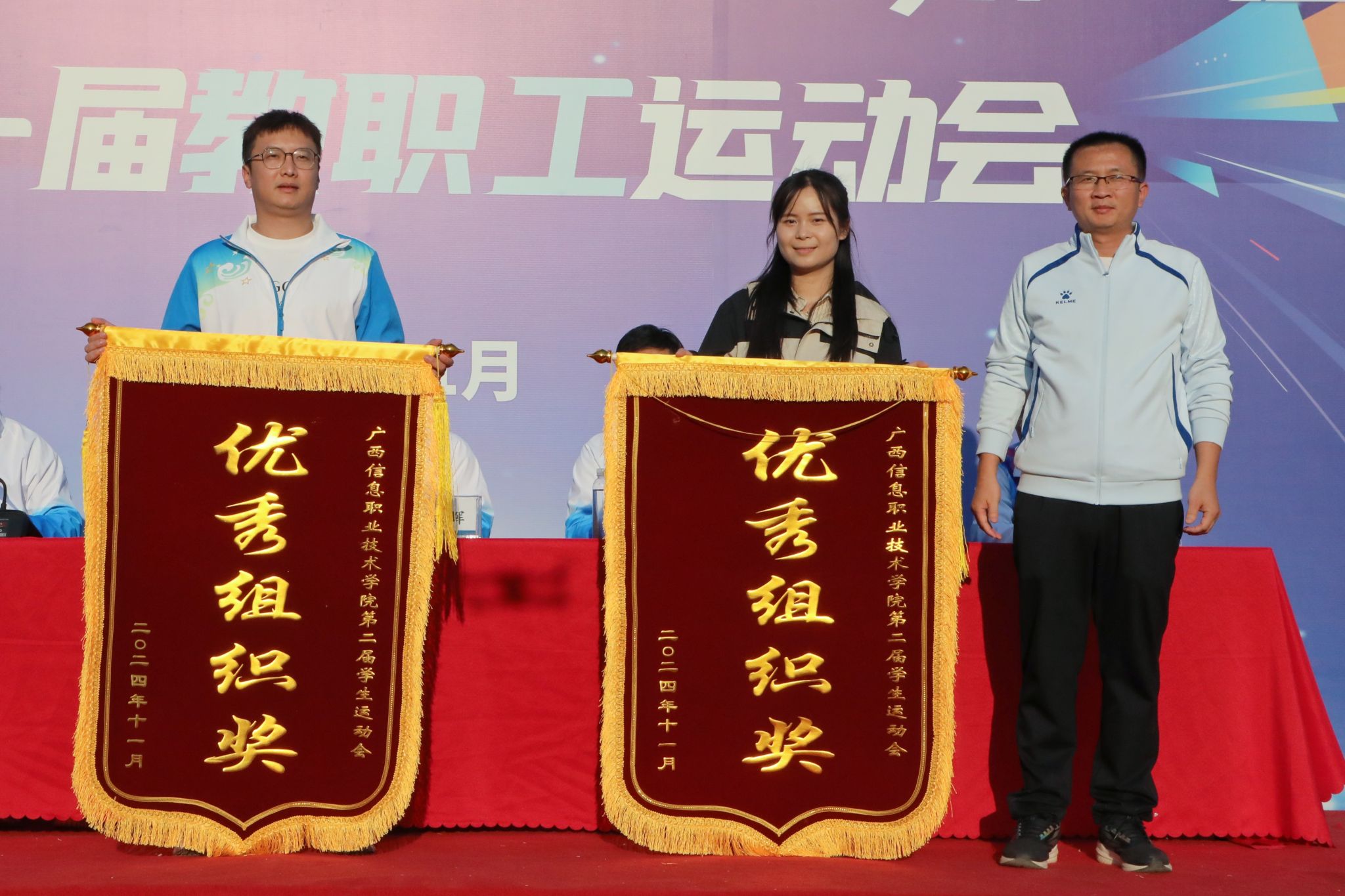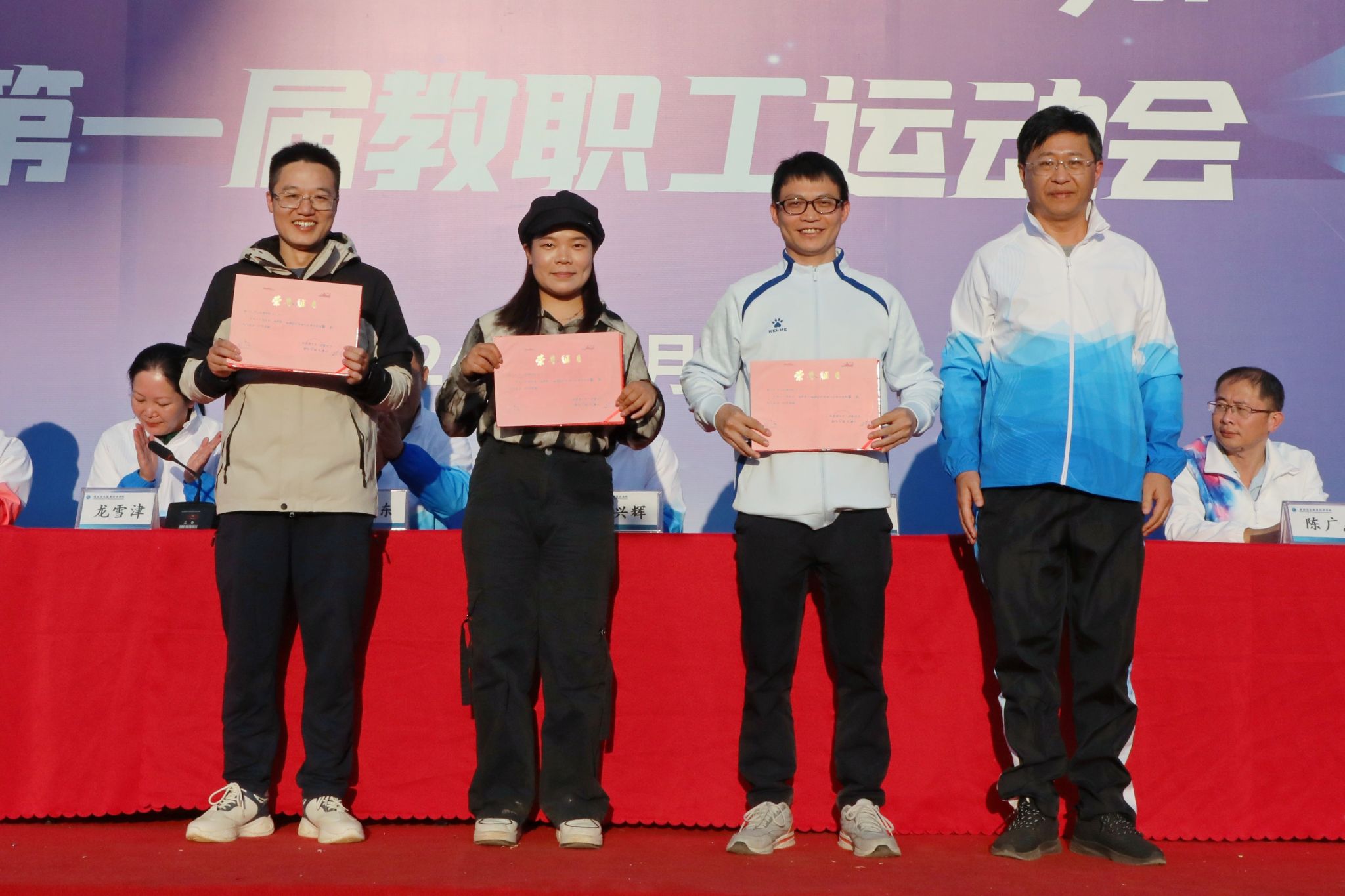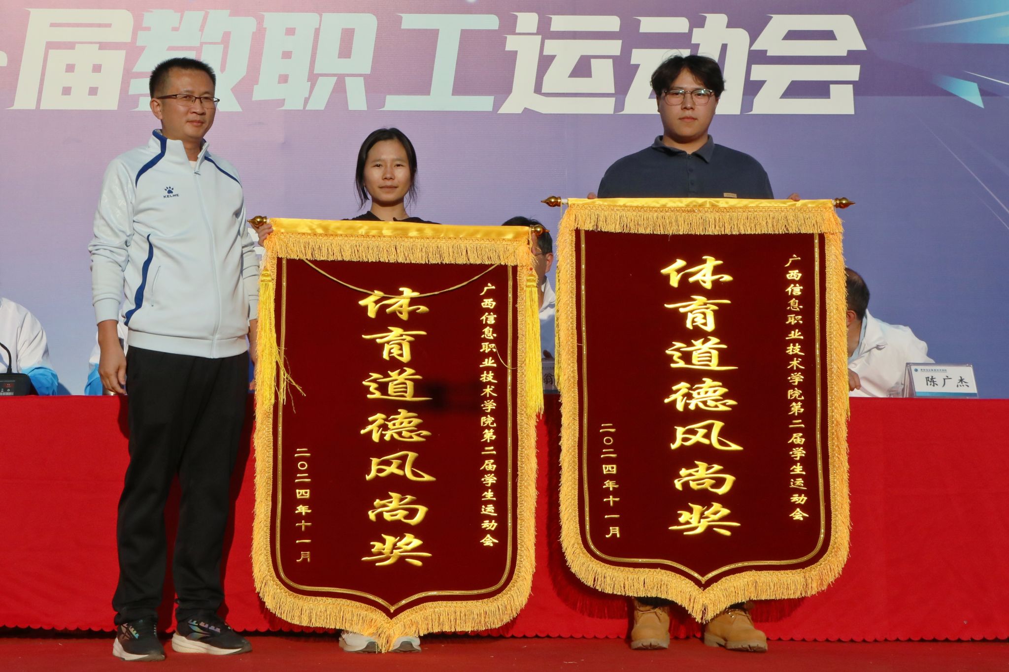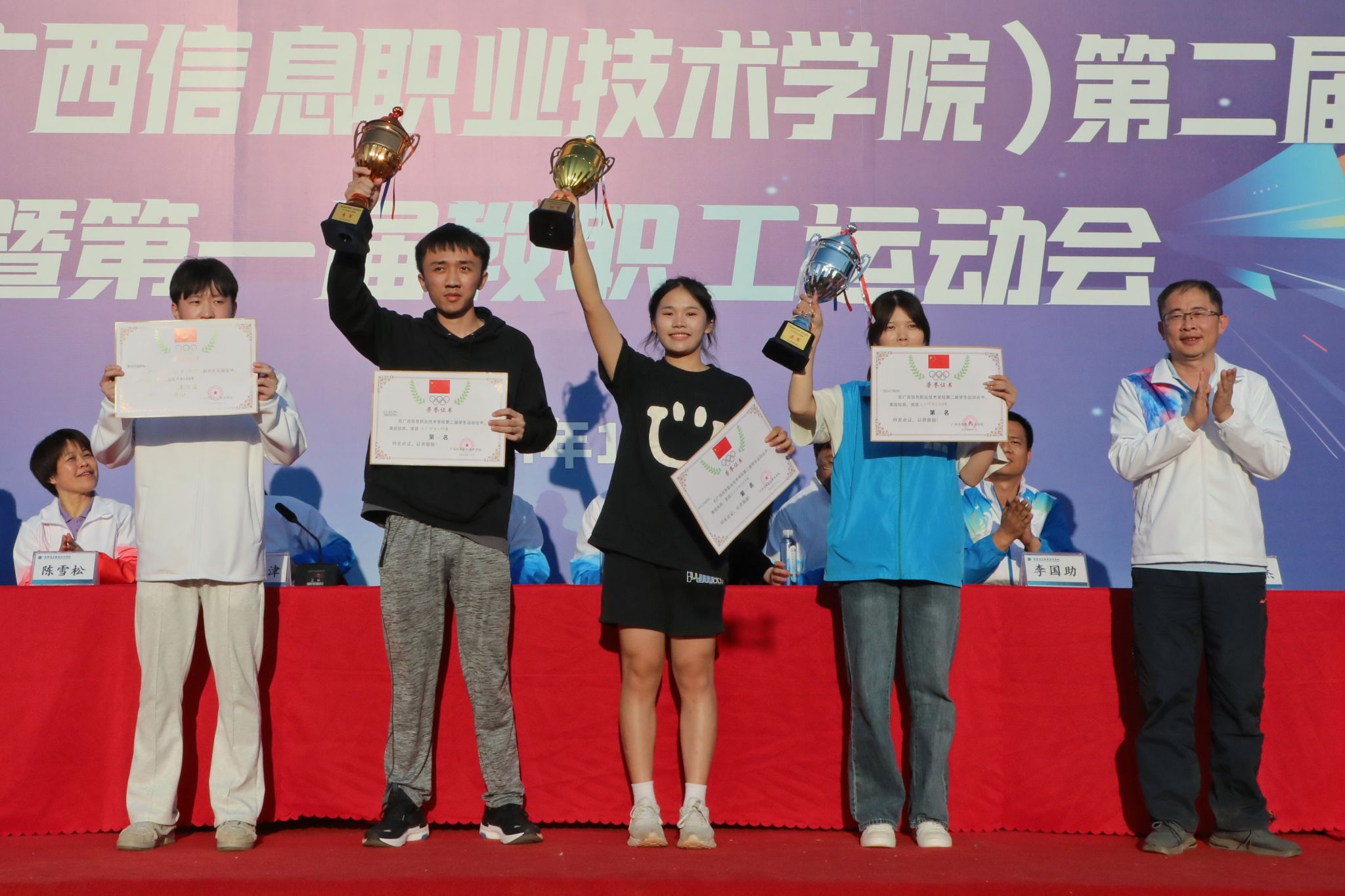 裁判长陈采铃宣读了比赛结果。数字经济与管理学院、数字艺术与传媒学院、北斗与通信学院(智能制造学院)分别获得团体总分的第一、二、三名。通识教育学院(国际教育学院、对外交流合作中心)分工会获得教职工团体总分第一名,数字经济与管理学院分工会、北斗与通信学院(智能制造学院)分工会获得教职工团体总分第二名,马克思主义学院分工会、机关第一分工会、机关第三分工会、机关第四分工会获得团体总分第三名。