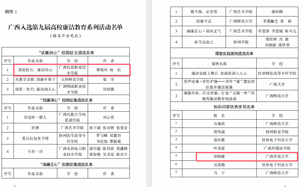 纪委办公室 姚姗汝报道 近日,自治区党委教育工委办公室转发了《教育部办公厅关于公布第九届高校廉洁教育系列活动结果的通知》,全国高校廉洁教育系列活动共遴选出“话廉润心”校园征文100篇、知识问答优秀学员100名,其中,pg娱乐2023级影视多媒体技术3班学生覃锦凤的作品《茶韵悠长,廉洁传心》(指导老师:杨红)入选“话廉润心”校园征文遴选名单。建设工程管理专业成招学生邱颖婕入选知识问答优秀学员名单。