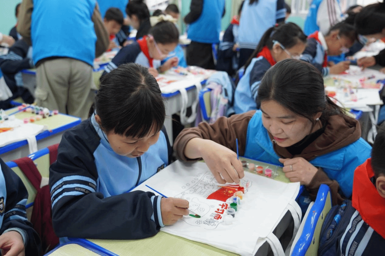 同学们在pg娱乐学生志愿者指导下,以绘画等形式创作主题帆布袋。活动尾声,pg娱乐向蒲庙镇中心学校捐赠了简笔画素材和绘画工具包。