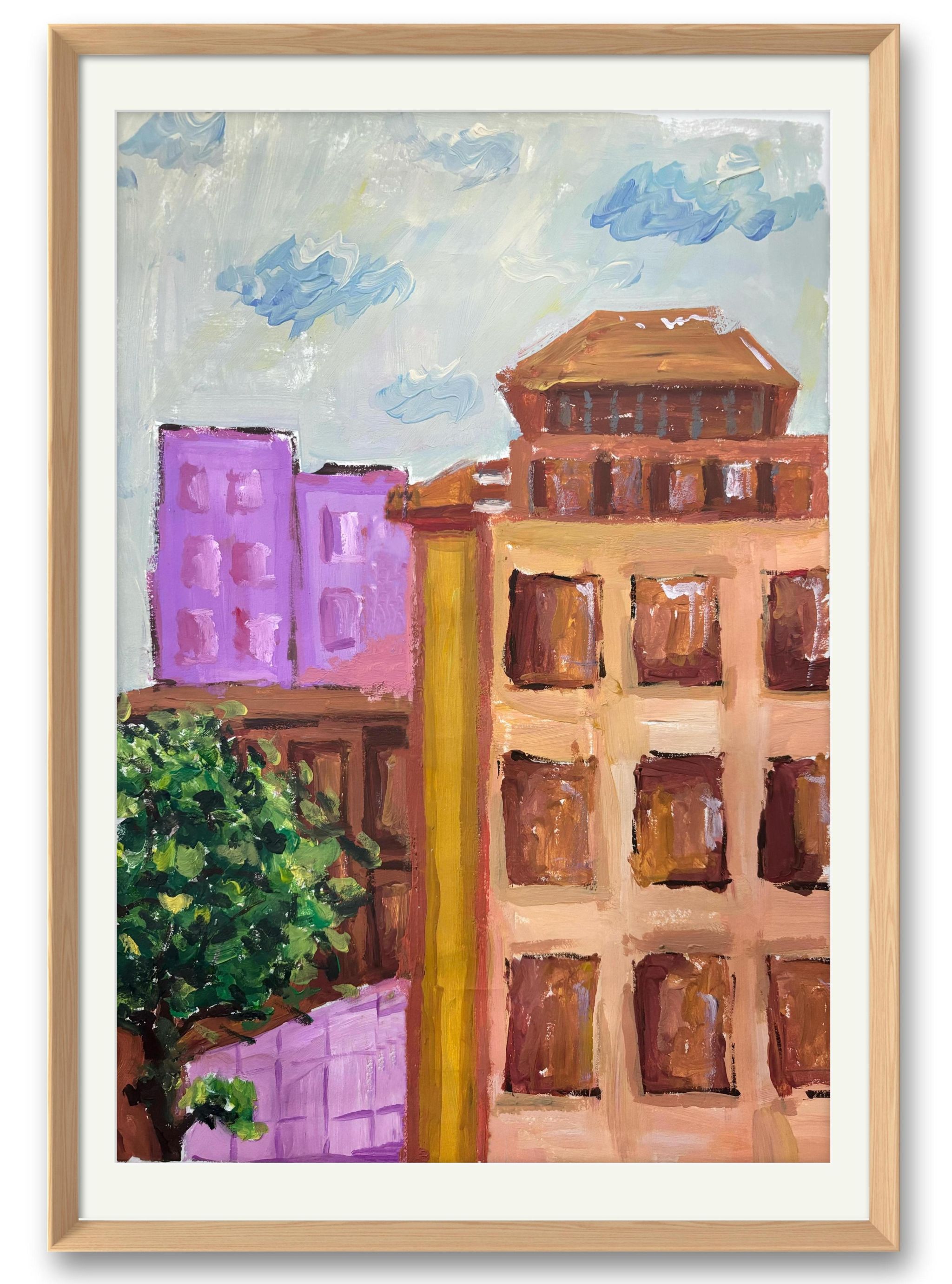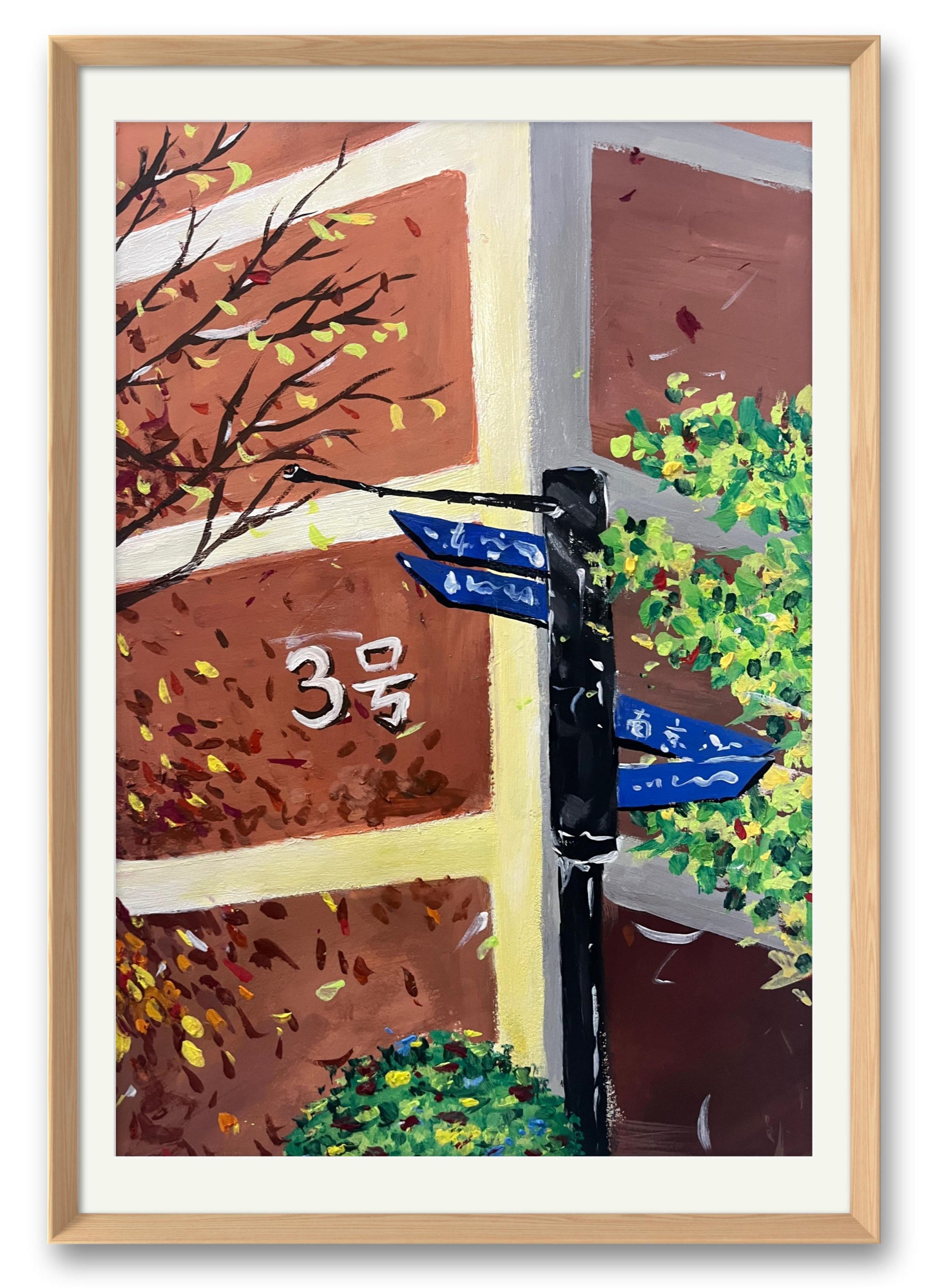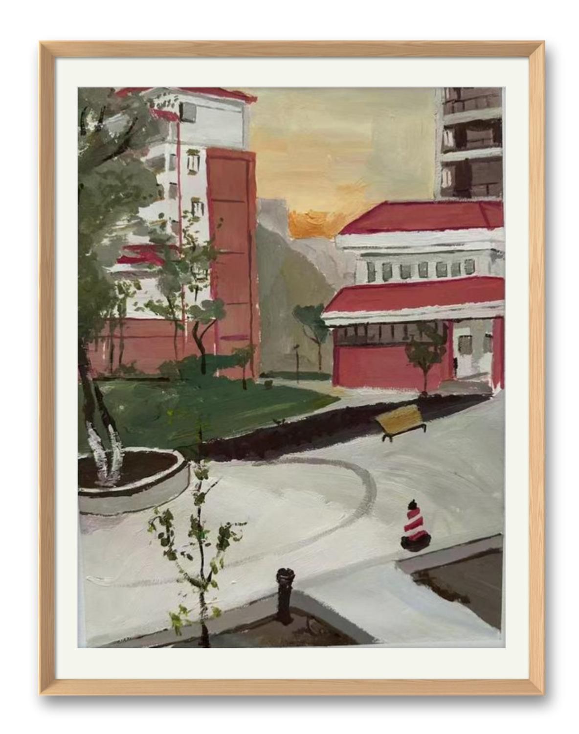 橙棕与粉紫的7:3色块对撞,左前写实绿树如歌圩休止符