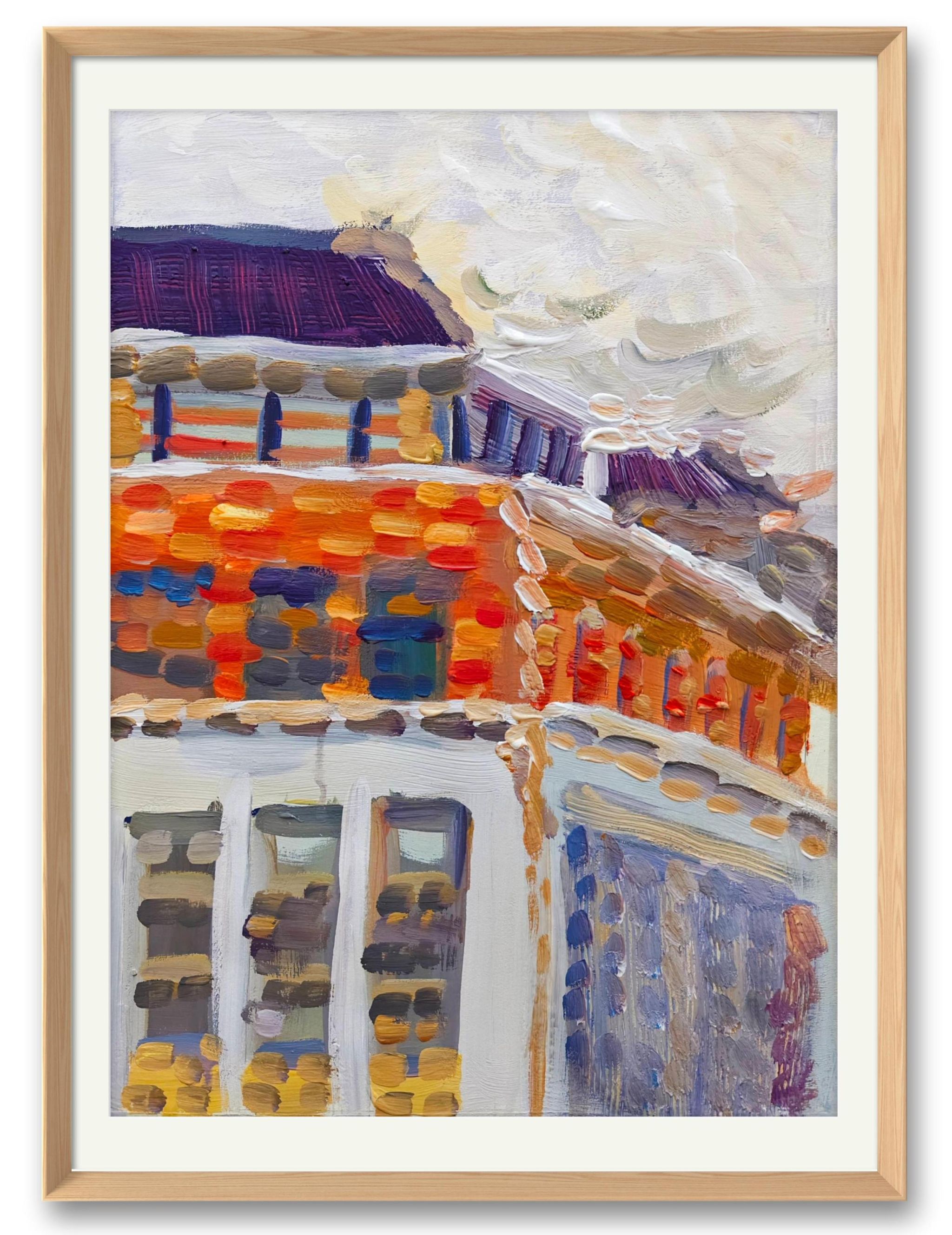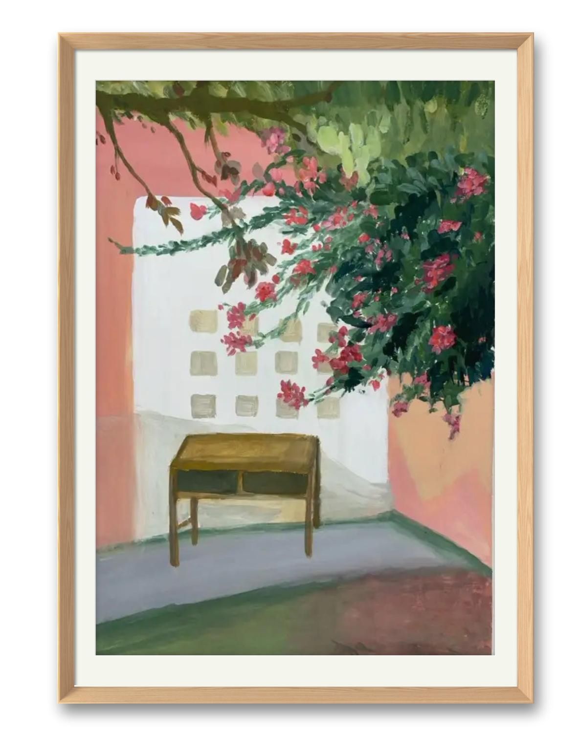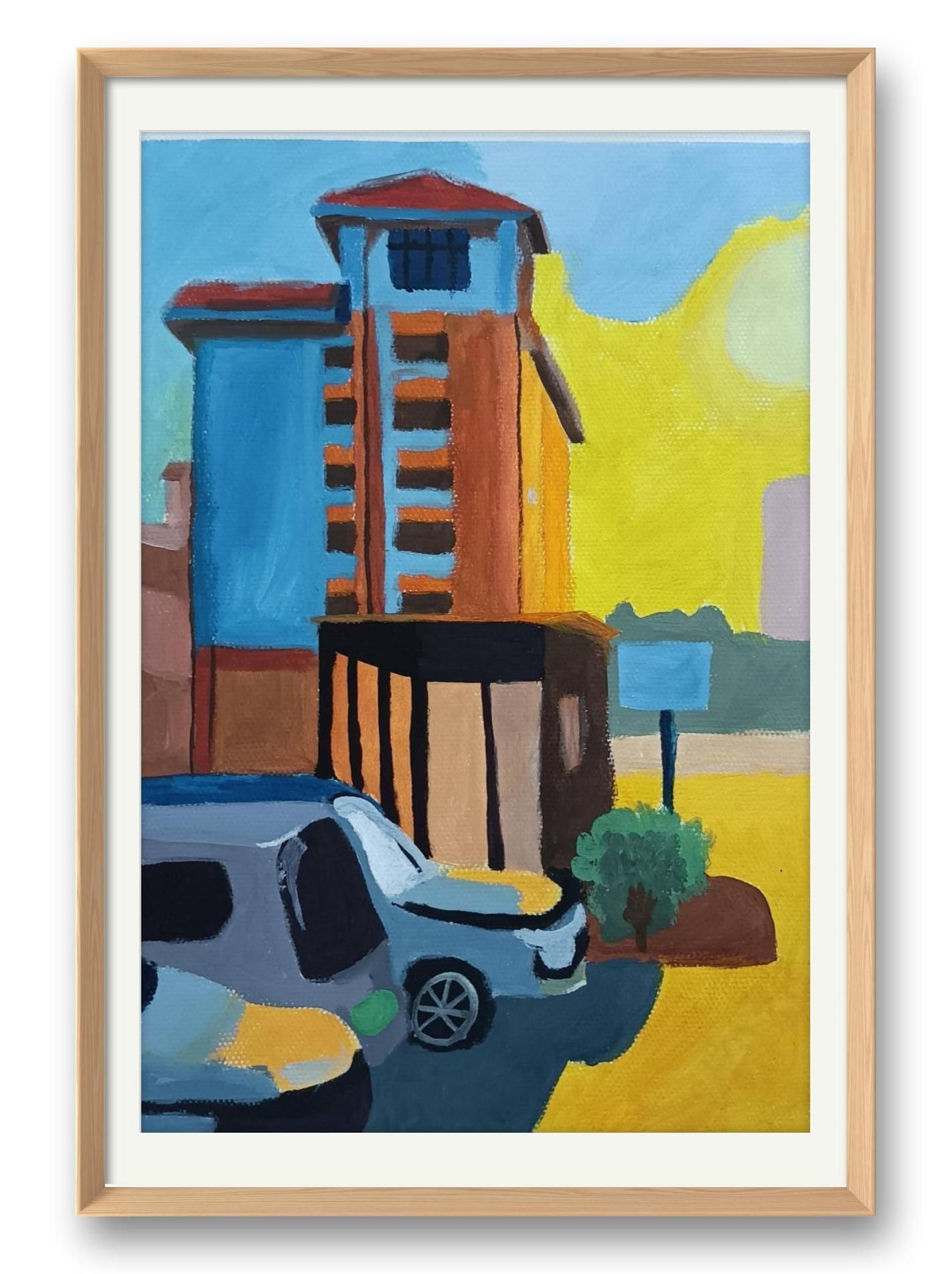 橙棕与粉紫的7:3色块对撞,左前写实绿树如歌圩休止符