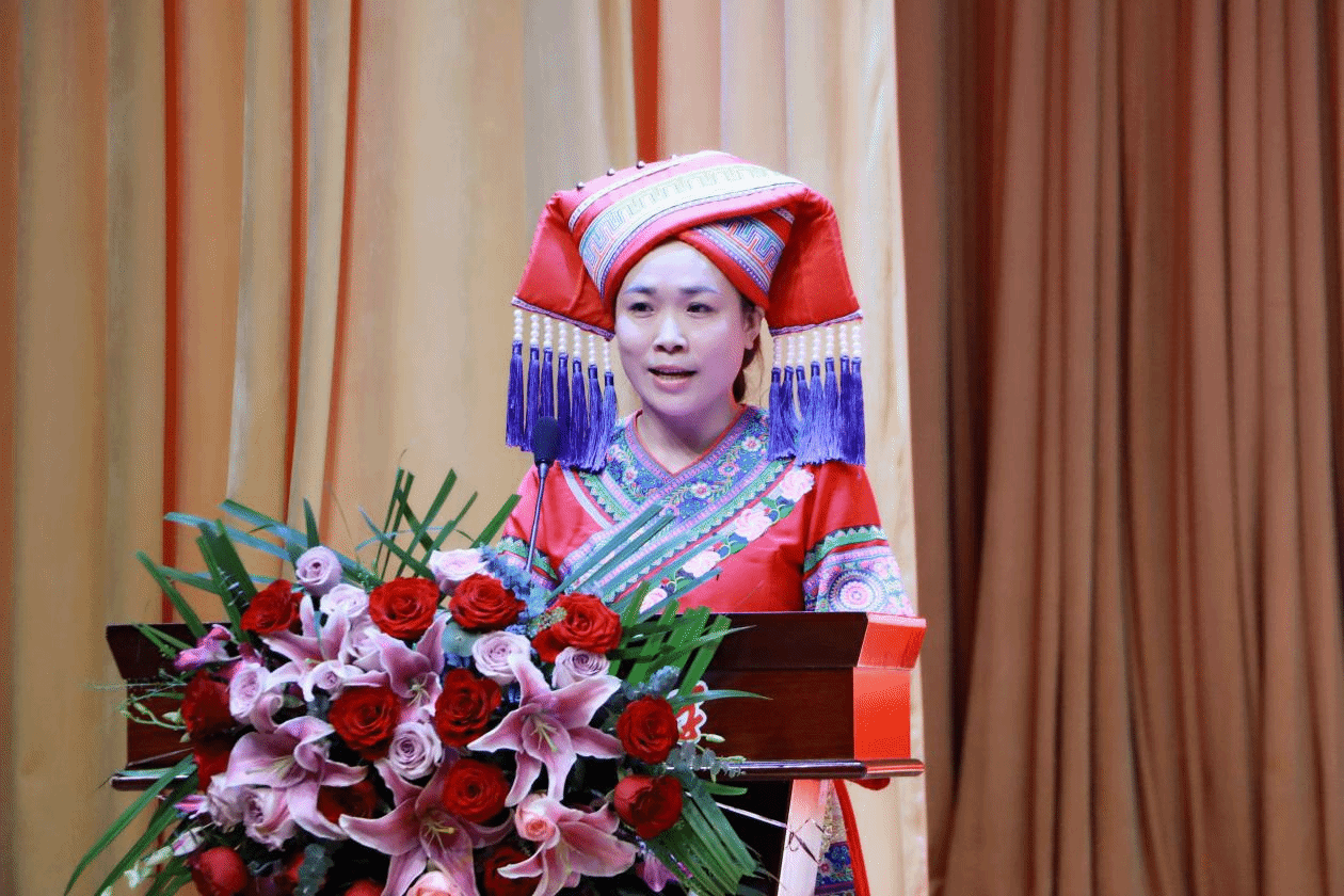老生代表韦益兰(2024年秋季本科行政管理专业、河池市劳动模范、韦益兰缫丝工技能大师工作室领军人)发言