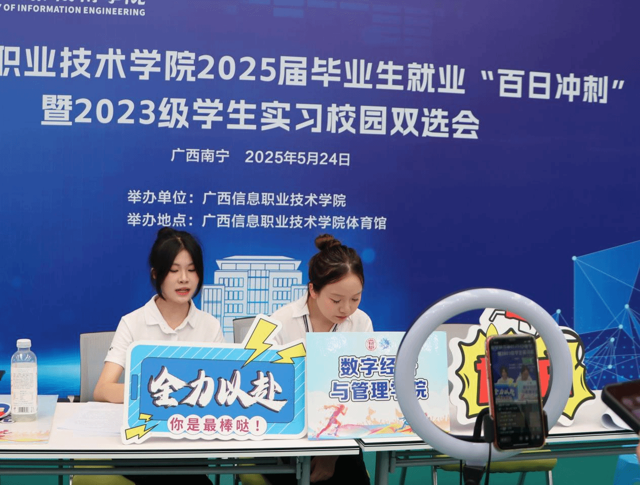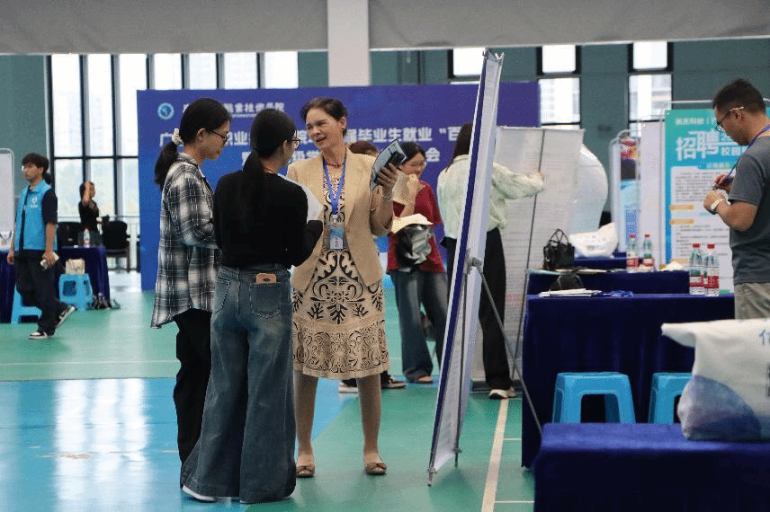 双选会现场气氛热烈,秩序井然。学校首次开设“直播带岗”,效果显著,吸引了近1400余人次观看。