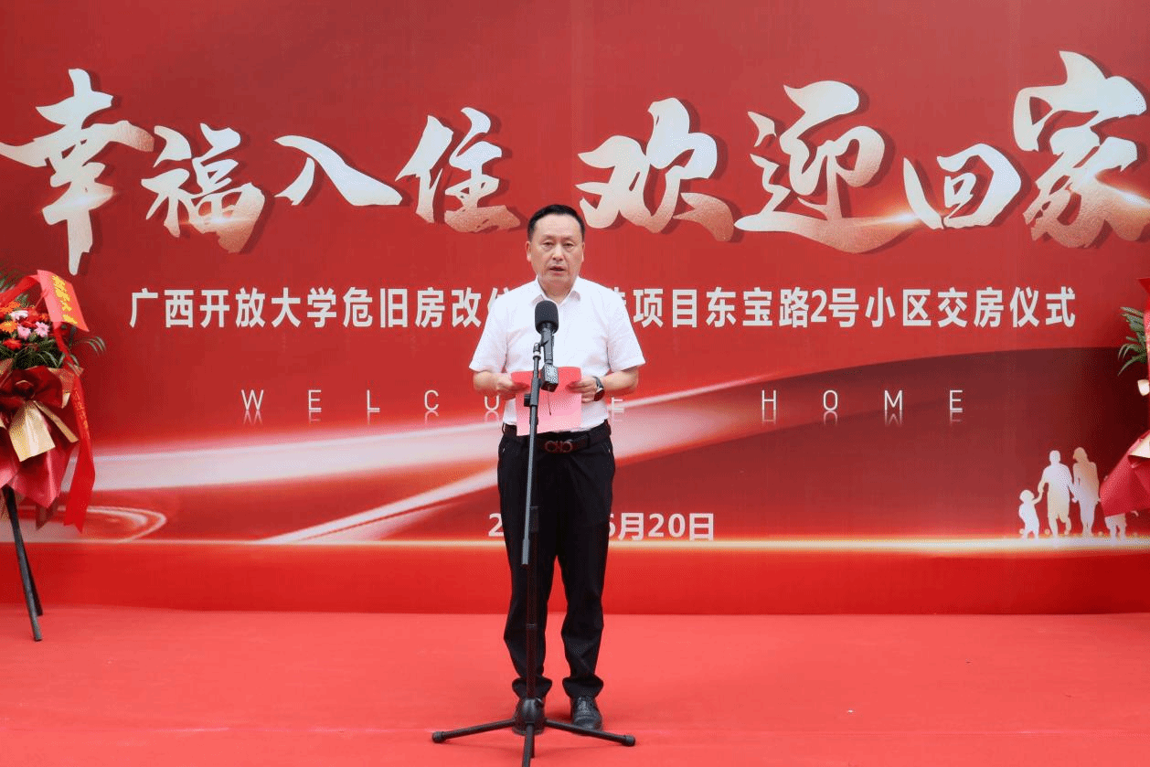 王兴辉校长在仪式上致辞,项目启动以来,学校大力践行以人民为中心的发展理念,将危旧改项目作为学校重大项目、头号民生工程来推进。在上级有关部门和学校党委、行政的大力支持和关心下,在学校有关部门、项目各参建单位的共同努力下,在广大教职工的理解和配合下,pg娱乐电子游戏官网入口危旧改项目顺利完成建设目标,如期交房。