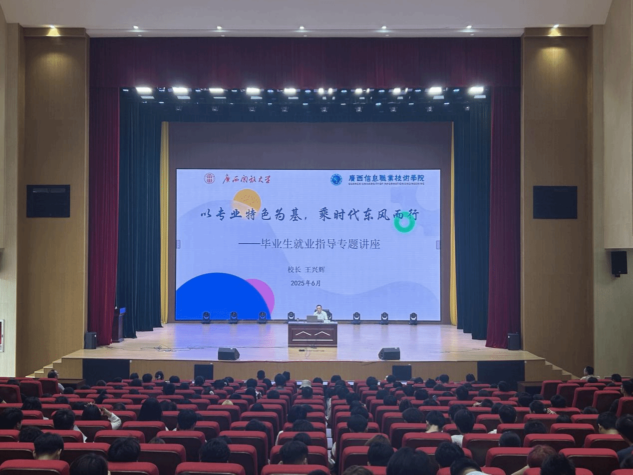 王兴辉以“以专业特色为基,乘时代东风而行”为主题,与同学们共同探讨如何立足学校专业优势,把握国家和广西经济发展机遇,实现高质量就业。他围绕就业形势与政策解读、国家政策与广西机遇、学校就业服务、职业规划、职场适应等五大核心维度,进行深入剖析,帮助同学们解码职场迷局,赋能求职竞争力,在信息技术浪潮中精准启航!他希望同学们对就业进行深入思考,厘清专业、职业、行业、事业四者的关系,结合实际情况合理设定就业目标,搭乘上大数据和智能时代的快车。