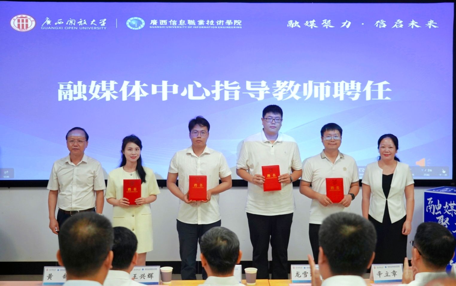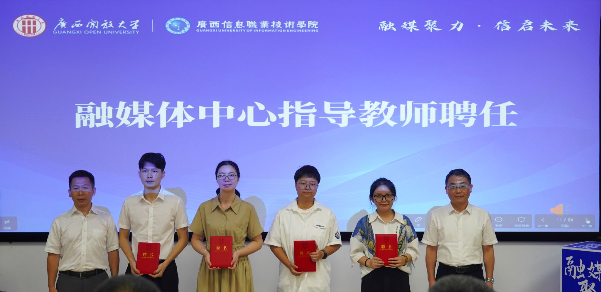 党委副书记龙雪津(右一)、副校长黄鹄(左一)为融媒体中心指导教师颁发聘书
