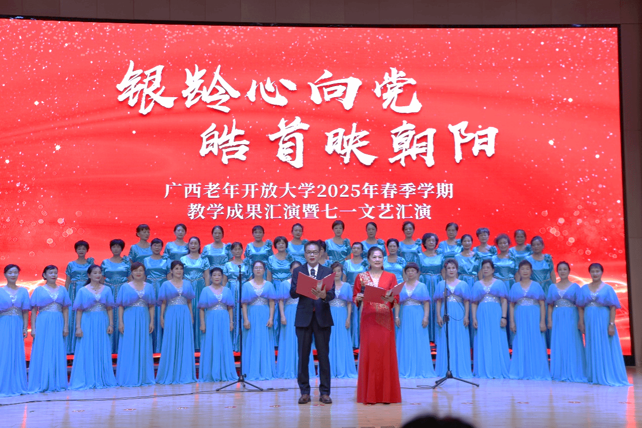 活动现场,12 个精心编排的节目依次上演:总校带来的女声合唱《桃花红杏花白》以悠扬旋律勾勒春日画卷,歌伴舞《世界赠予我的》用灵动舞姿与悦耳歌声交织感恩之情,小提琴齐奏《花儿与少年》以欢快节奏迸发活力激情,表演唱《浓情三月迎客歌》、独唱《我心属于军旗》与古典舞《烟雨小镇》则通过声乐与舞姿的切换,尽显传统文化的多元魅力;安吉教学点的舞蹈《妈妈的琴》、贵港开放大学的葫芦丝《红歌四联奏》、枫林蓝岸教学点的乐队组合 + 合唱《大地飞歌》等节目,从不同维度诠释对党的忠诚与生活的憧憬;梧州开放大学的健身气舞《生命》以动感韵律展现健康风貌,江南客运站教学点的旗袍走秀《浮年盏》用雅致步态演绎岁月风华,津头教学点的舞蹈《铜鼓敲响幸福来》传递丰收喜悦。