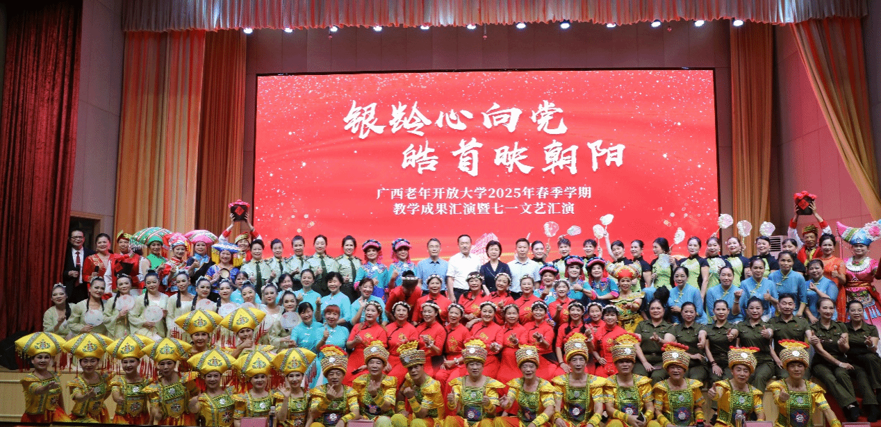 广西老年开放大学 卓芍 报道 7月3日上午,“银龄心向党 皓首映朝阳”迎七一文艺演出暨期末教学成果展演在pg娱乐电子游戏官网入口一楼报告厅举行。校长王兴辉、副校长李敏智、辛立章、黄远鸣出席活动,与老年学员们共庆党的生日,共享老年教育成果。