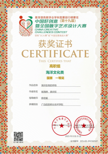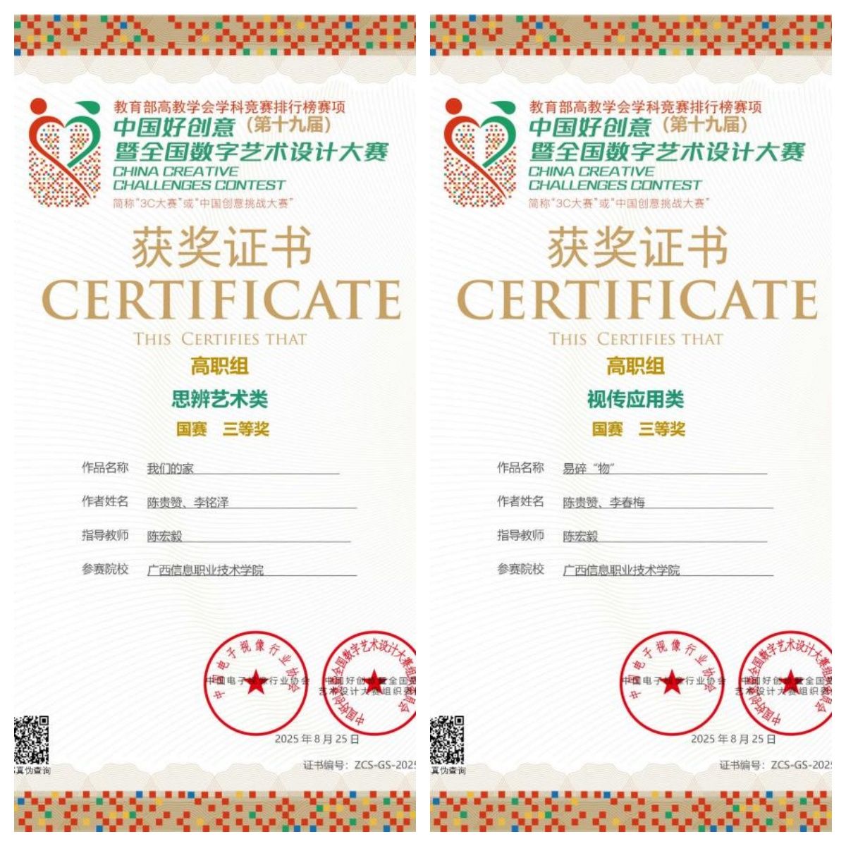 数字艺术与传媒学院 陈宏毅 报道 近日,第19届中国好创意暨全国数字艺术设计大赛(China Creative Challenges Contest,简称3C大赛)全国总决赛落幕。pg娱乐数字艺术与传媒学院学子杨海婷、廖庆权的作品《海洋生物的呼唤》获一等奖,陈贵赞、李铭泽的作品《我们的家》和陈贵赞、李春梅的作品《易碎“物”》获得三等奖,陈宏毅老师荣获“优秀指导教师”奖。