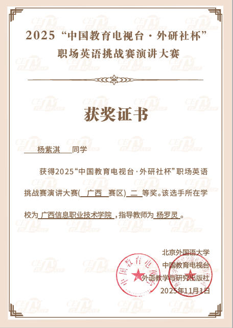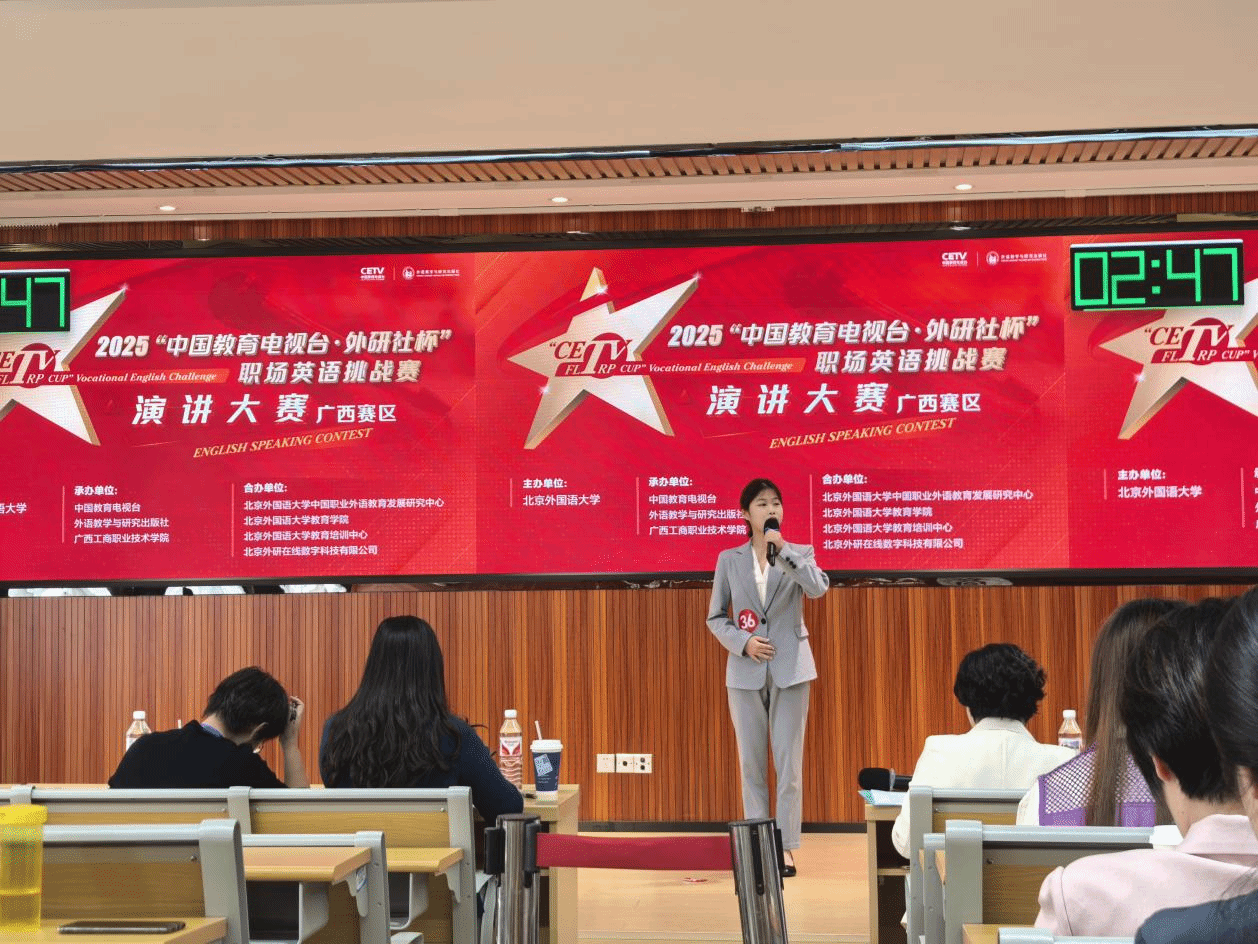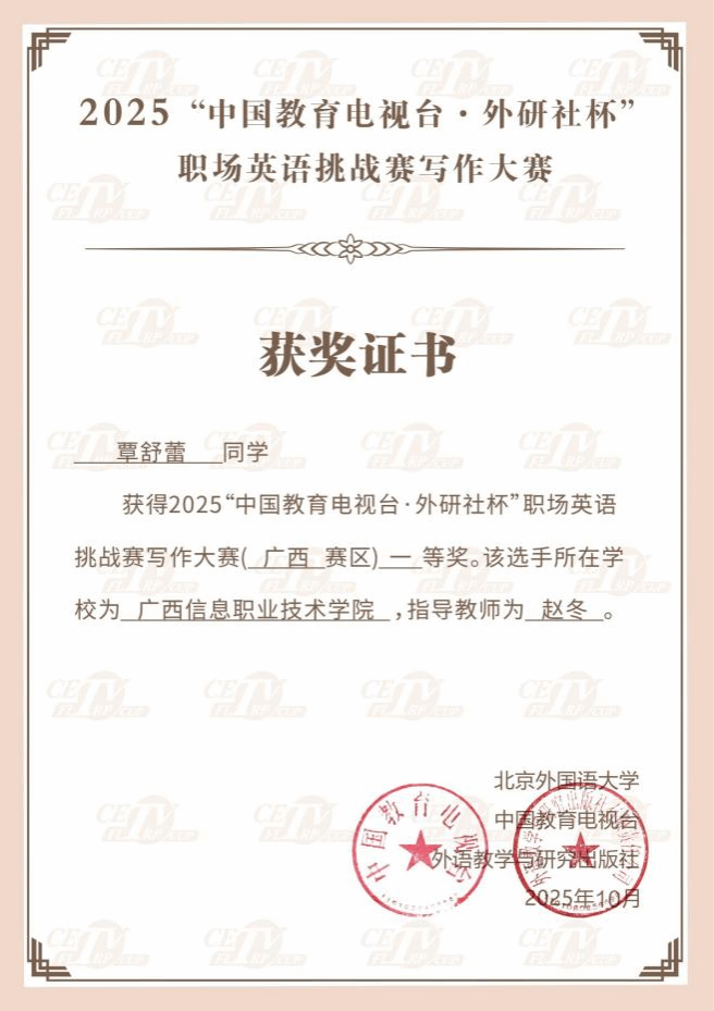 通识教育学院 赵冬 报道 近日,2025年“中国教育电视台·外研社杯”职场英语挑战赛广西赛区比赛圆满收官。pg娱乐学子在比赛中表现出色,荣获英语写作比赛一等奖1项、三等奖1项,英语演讲比赛二等奖1项、三等奖1项。其中,数管学院2024级跨境电商专业覃舒蕾同学获写作大赛一等奖,成功晋级全国总决赛。