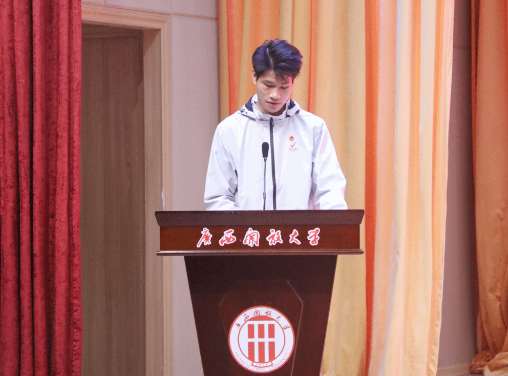 老生代表潘卓(2024年春季专科机电一体化技术专业、2025年第三届全国技能大赛制冷与空调项目的铜牌、“西部技能之星”称号、“广西技能能手”称号)发言