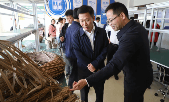 学校副校长黄远鸣(左一)参观都安开放大学数字藤编产业学院