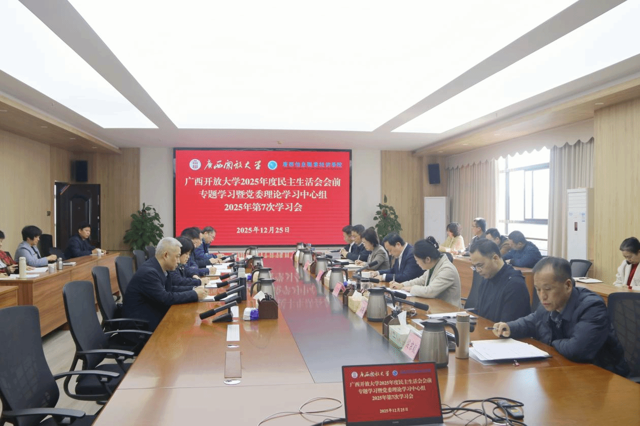 王兴辉以《锚定“十五五”发展目标 凝心聚力开好民主生活会 筑牢学校教育事业高质量发展根基》为题作重点发言。他指出,“十五五”时期是我国在全面建成小康社会基础上,向2035年基本实现社会主义现代化迈进的关键五年。当前,学校正处于“十四五”规划冲刺收官与“十五五”规划谋篇布局的关键交汇期,更是转型发展与战略跃升的重要机遇窗口。学校必须精准把握政策红利释放、需求升级驱动、数字技术赋能重塑教育发展的重大机遇,主动识变应变求变,在新时代发展浪潮中精准锚定办学方向。要积极构建泛在可及的终身教育体系,统筹整合校内外优质资源,推动开放教育、学历继续教育、高职教育、社区教育、老年教育、社会培训等多元教育融通互促、高质量发展,全力打造广西终身教育体系建设的核心引擎。要持续巩固数字教育先发优势,推动人工智能等新技术与教育教学、管理服务深度融合创新,赋能教育治理现代化。要聚焦校园文化内涵深度挖掘与价值引领,全面推进校园文化建设提质增效,切实增强文化育人的浸润力与实效性。学校通过五年攻坚突破,力争到2030年基本建成“放心、美丽、文明、智慧、特色鲜明的区域性高水平新型大学”。