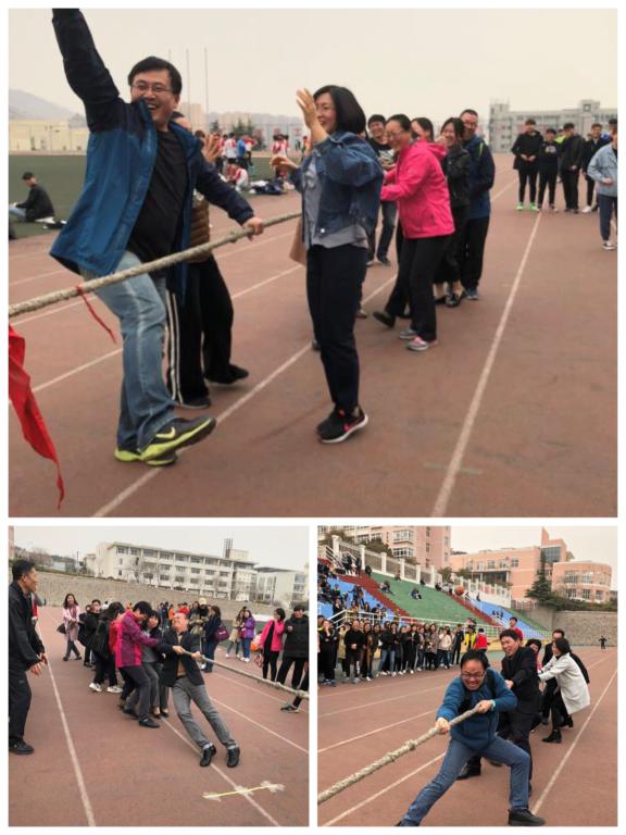 在院长尹洪山和书记姜德杰的带领下,老师们踊跃报名。下午3时,老师们齐聚崂山校区田径场,每10人一队,两两对决,以率先拔过中线的一队取得胜利。比赛中,老师们个个咬紧牙关,紧握绳子,一旁的学生们也纷纷为喜爱的老师们加油鼓劲。加油声、欢笑声此起彼伏,热闹非凡。整个比赛现场仿佛是一片欢乐的海洋,处处洋溢着健身的喜悦和团结友爱、拼搏向上的精神。