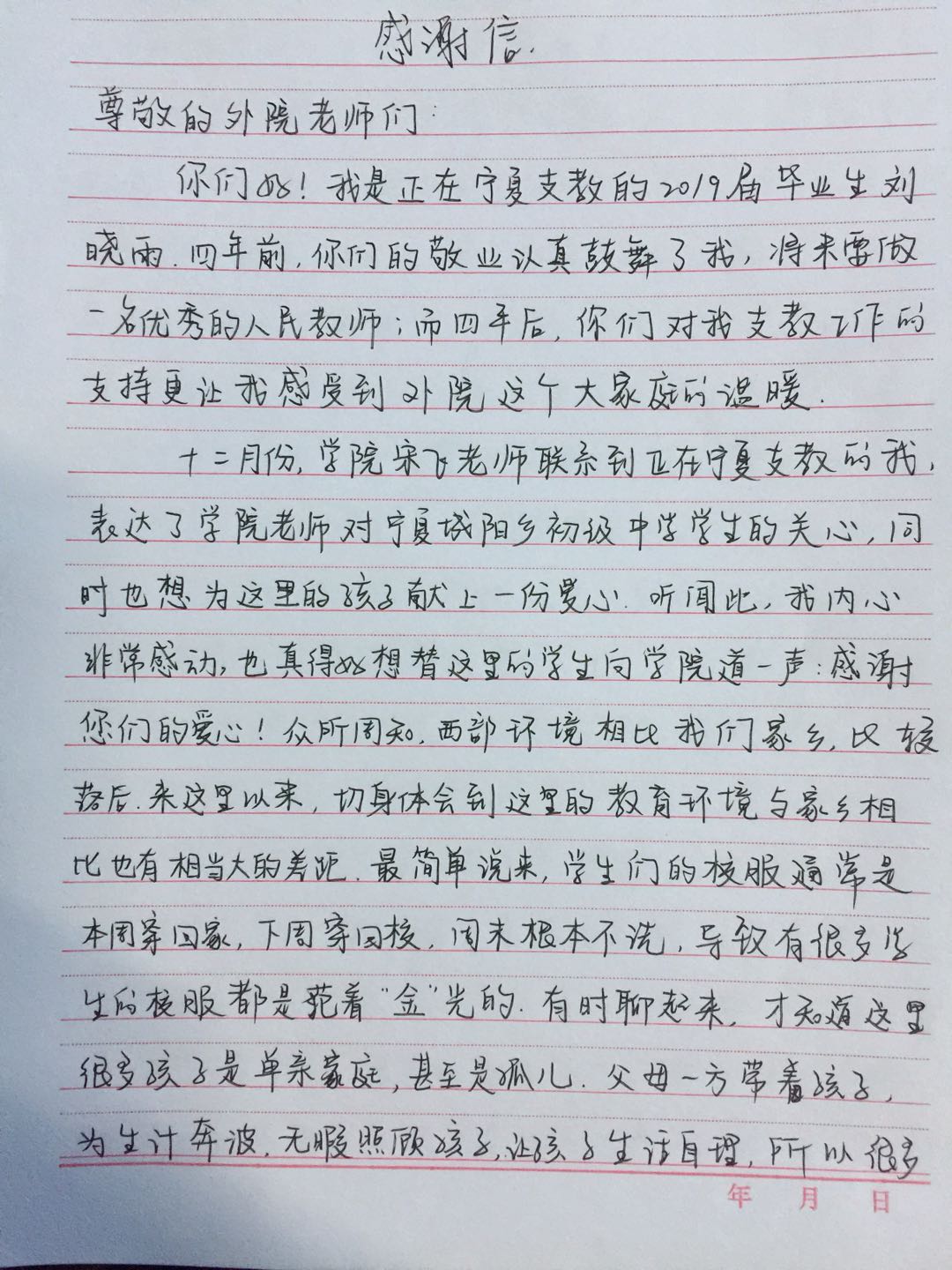 12月31日,宁夏城阳乡初级中学举行了爱心衣物发放仪式,刘晓雨代表学院为同学们发放了爱心衣物,一方面,提高了同学们的学习积极性,另一方面,为贫困学生解决了实际困难。1月2日,刘晓雨发来感谢信,信中提到,感谢多年来学院、老师对于其本人的培养和支持,师恩难忘、感恩外院;感谢外院对青科大研究生支教团的支持和帮助,同时,替收到爱心衣物的同学们表达了感激之情。