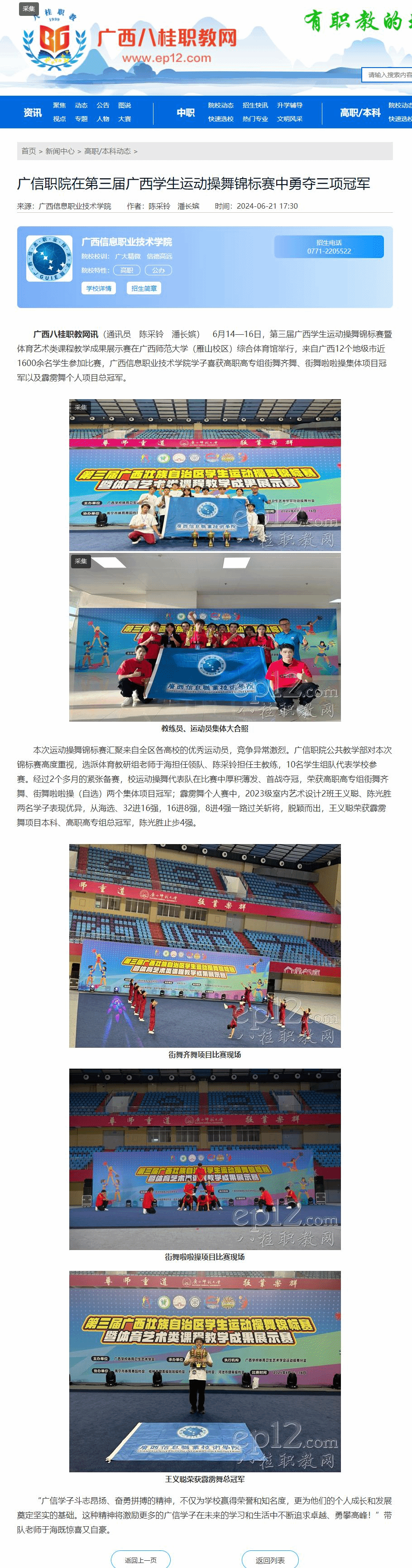 党委宣传部 报道 2024年6月21日,广西八桂职教网以“广信职院在第三届广西学生运动操舞锦标赛中勇夺三项冠军”为题,报道广信学子在第三届广西学生运动操舞锦标赛暨体育艺术类课程教学成果展示赛中取得优异成绩。现将报道转载如下。