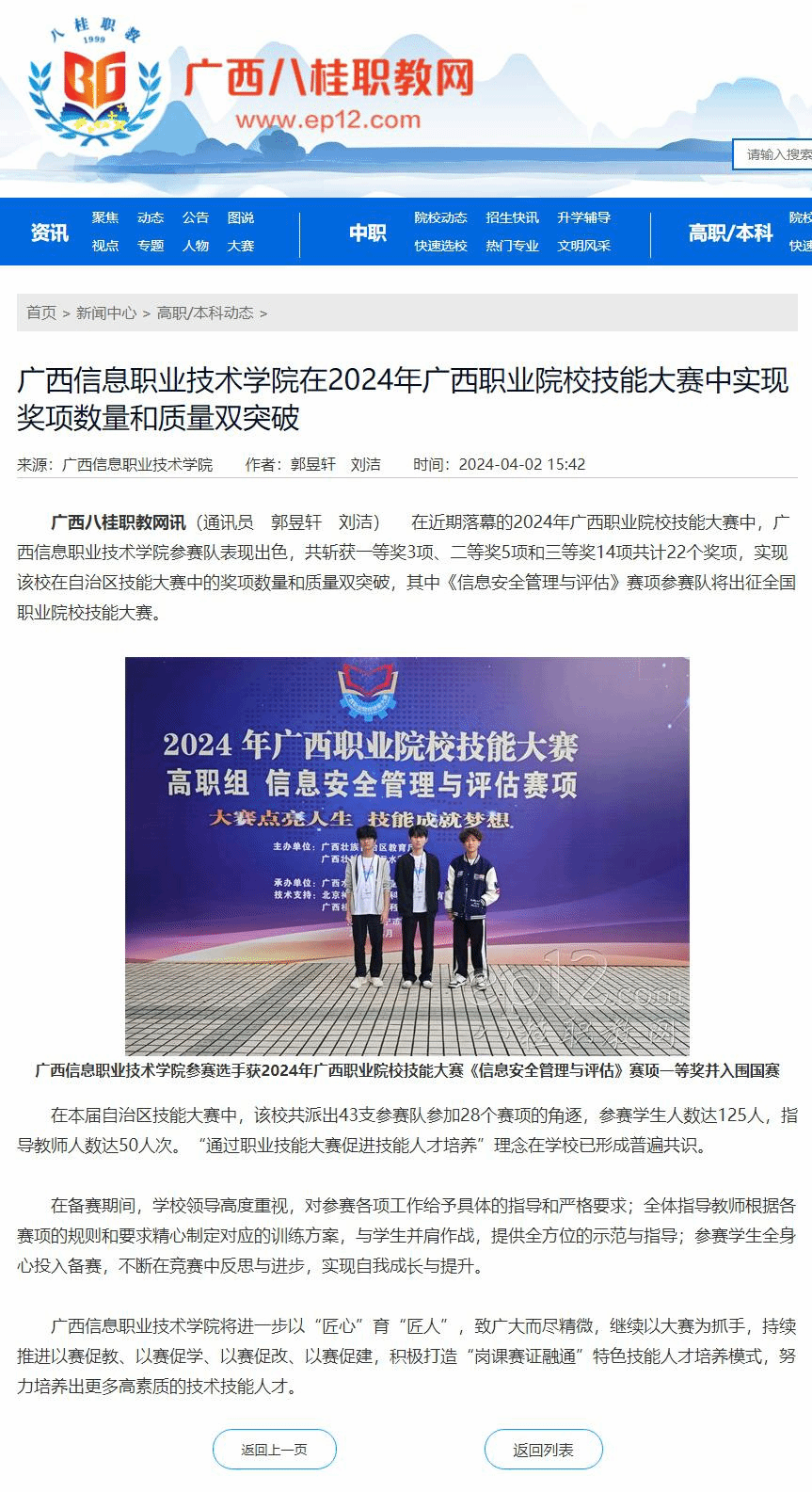 党委宣传部 报道 2024年4月2日,广西八桂职教网以“pg娱乐电子游戏官网入口在2024年广西职业院校技能大赛中实现奖项数量和质量双突破”为题,报道pg娱乐在2024年广西职业院校技能大赛获奖情况。现将报道转载如下。