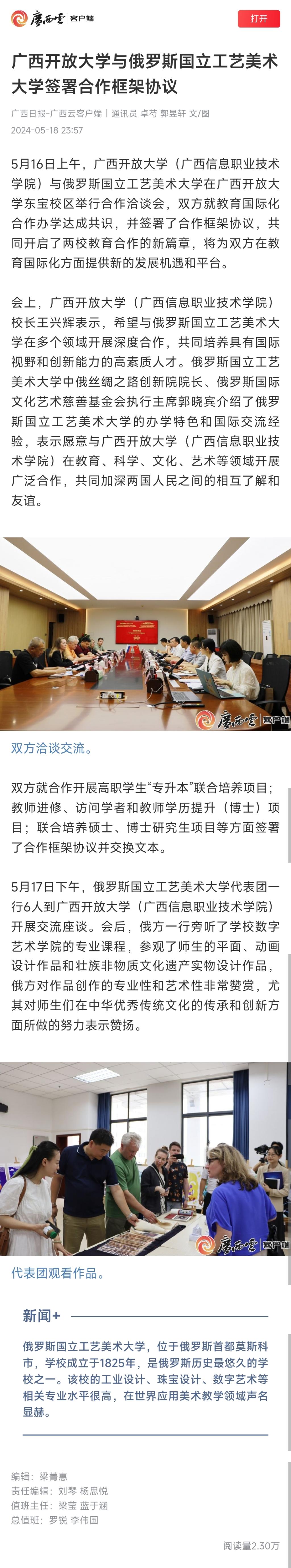 党委宣传部 报道 2024年5月21日,广西日报-广西云以“pg娱乐电子游戏官网入口与俄罗斯国立工艺美术大学签署合作框架协议”为题,报道pg娱乐开启教育国际化合作办学新篇章情况。现将报道转载如下: