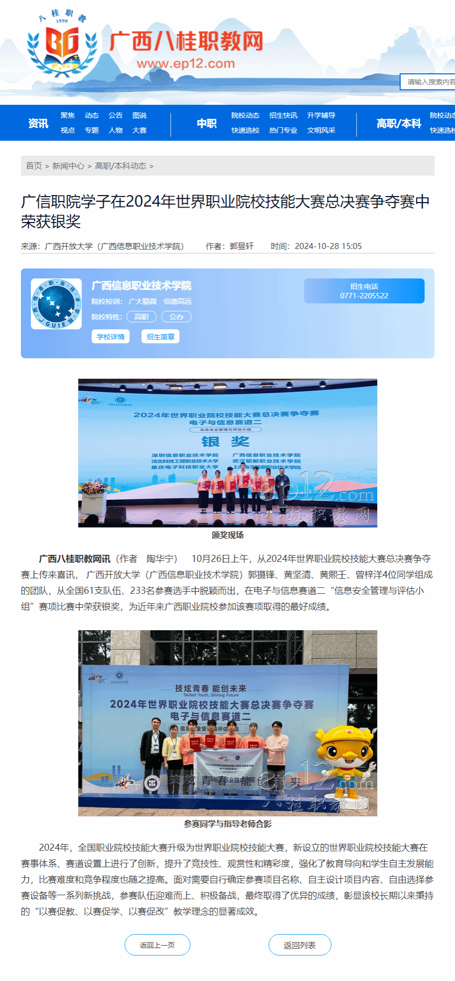 党委宣传部 报道 10月28日,广西八桂职教网以“广信职院学子在2024年世界职业院校技能大赛总决赛争夺赛中荣获银奖”为题,报道pg娱乐学子获奖情况。现将报道转载如下。原报道链接:http://www.ep12.com/a/xinwen/gzdt/2024/1028/105900.html