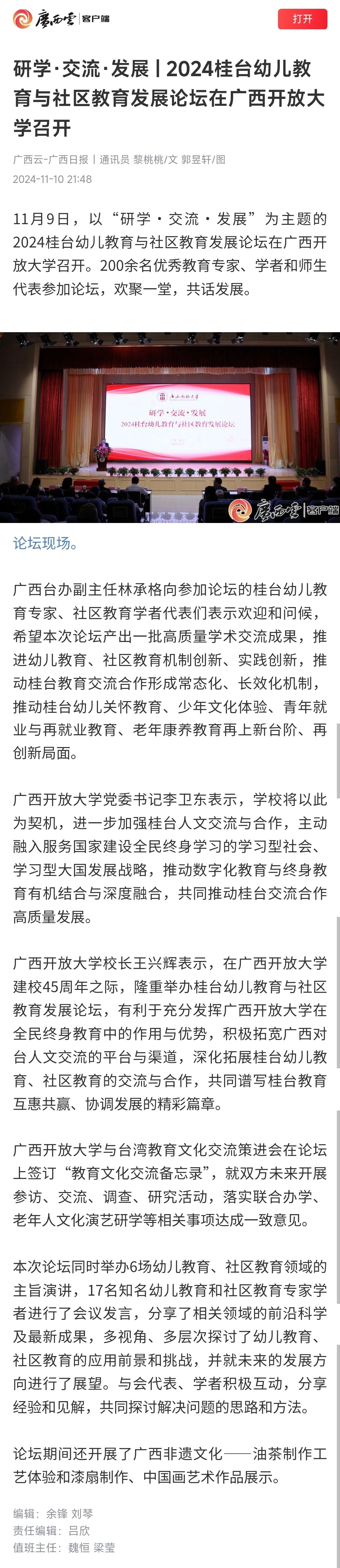 党委宣传部 报道 11月10日,广西云-广西日报以“研学·交流·发展 | 2024桂台幼儿教育与社区教育发展论坛在pg娱乐电子游戏官网入口召开”为题,报道论坛在pg娱乐召开的相关情况。现将报道转载如下。