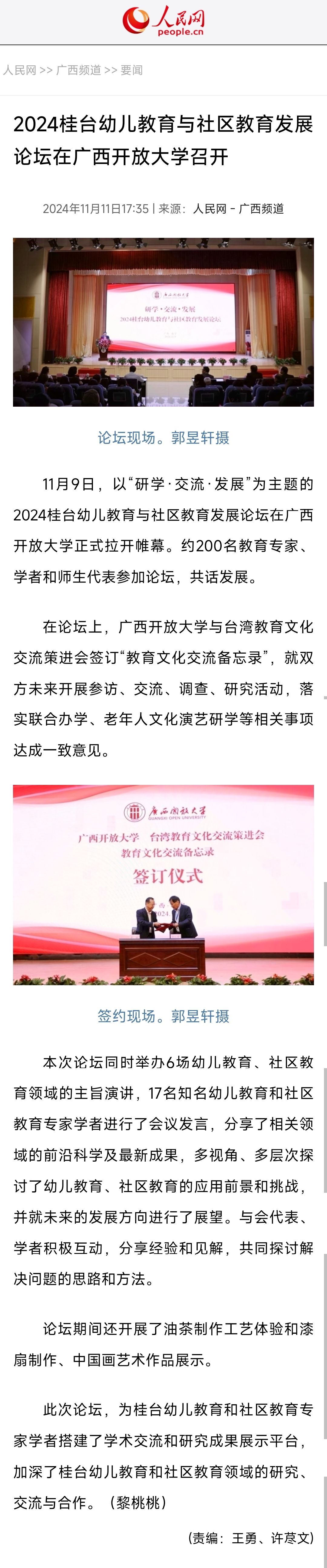 党委宣传部 报道 11月11日,人民网-广西频道以“2024桂台幼儿教育与社区教育发展论坛在pg娱乐电子游戏官网入口召开”为题,报道论坛在pg娱乐召开的相关情况。现将报道转载如下。