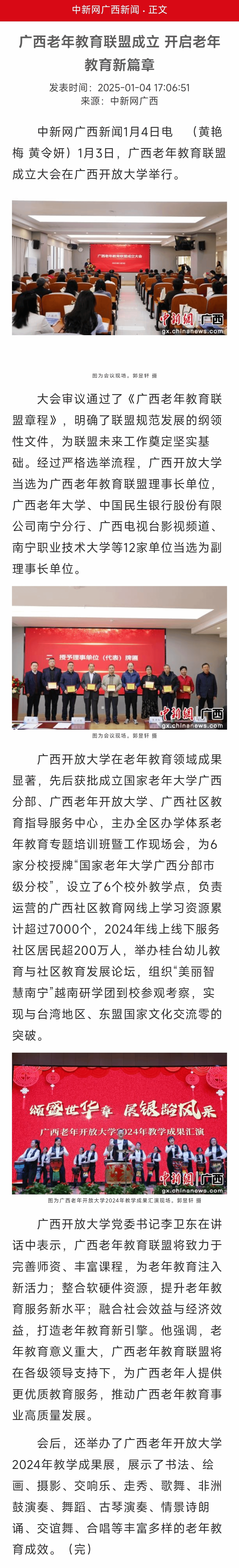 党委宣传部 报道 1月3日,中国新闻网以“广西老年教育联盟成立 开启老年教育新篇章”为题,报道pg娱乐举行广西老年教育联盟成立大会相关情况。现将报道转载如下。