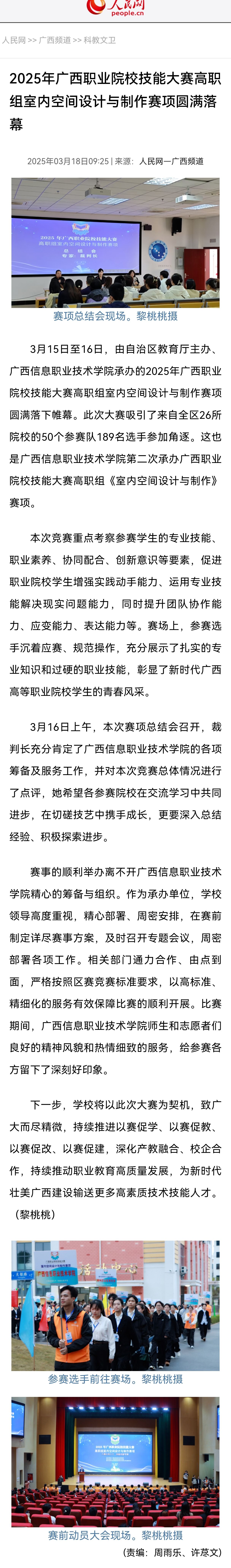 3月18日,人民网-广西频道以“2025年广西职业院校技能大赛高职组室内空间设计与制作赛项圆满落幕”为题,报道pg娱乐承办比赛相关情况。现将报道转载如下。