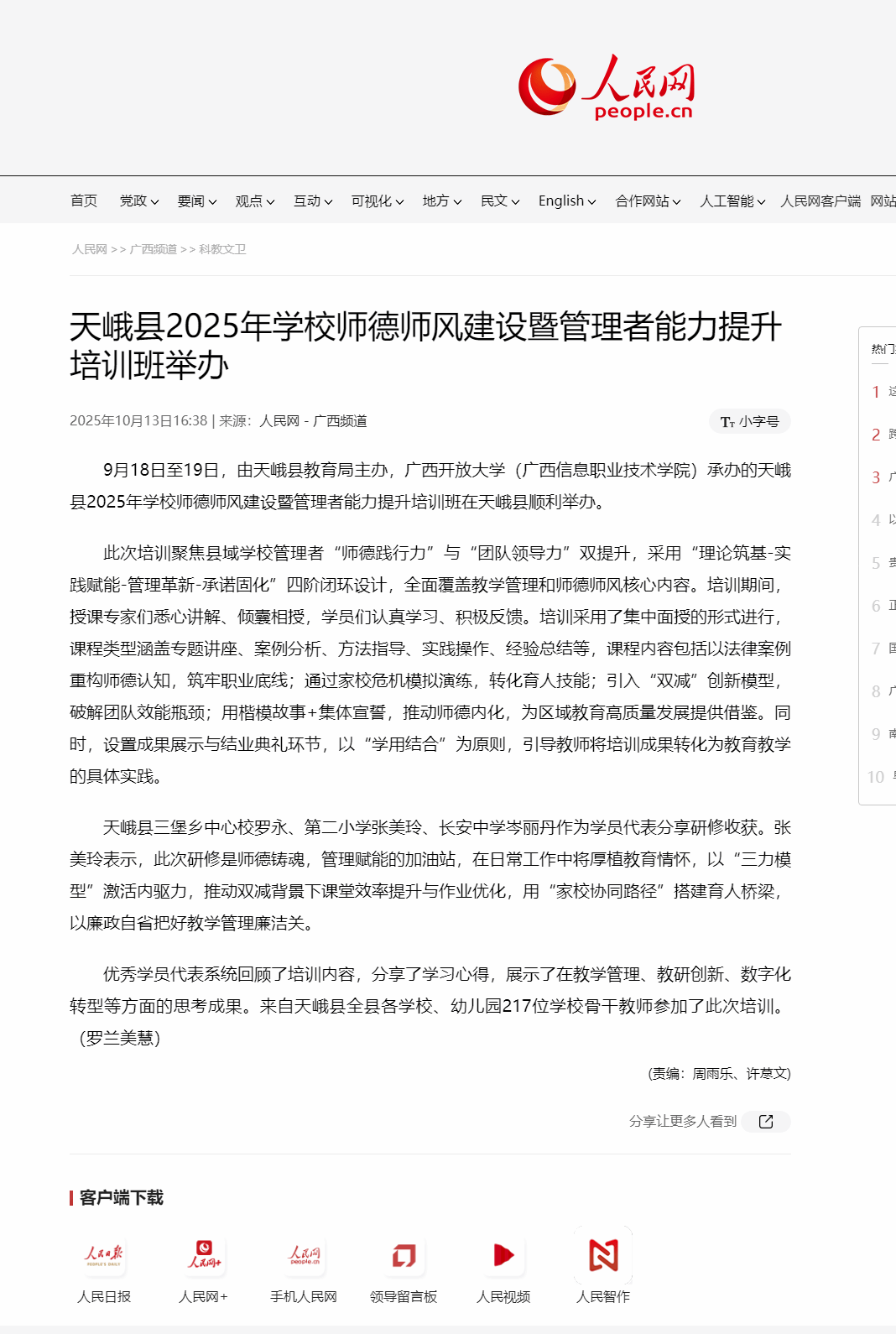 10月13日,人民网-广西频道以“天峨县2025年学校师德师风建设暨管理者能力提升培训班举办”为题,报道了由天峨县教育局主办,pg娱乐电子游戏官网入口承办的天峨县2025年学校师德师风建设暨管理者能力提升培训班在天峨县顺利举办的相关情况。现将报道转载如下。