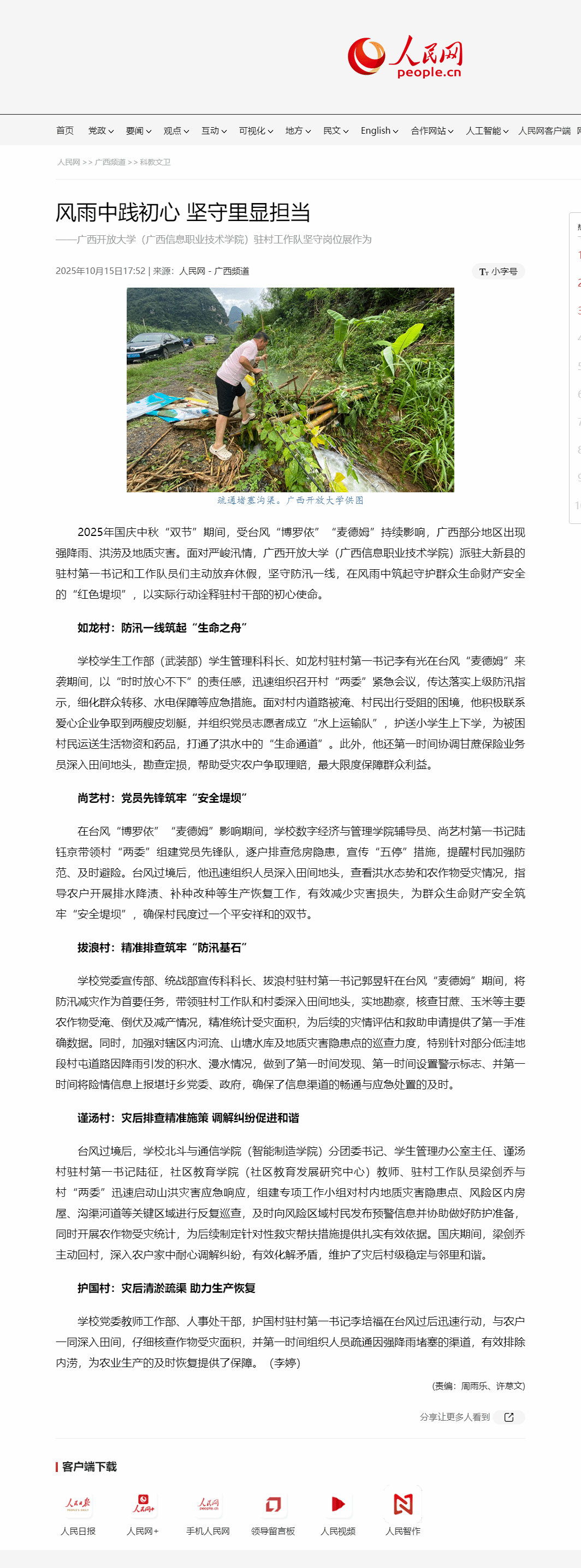 10月15日,人民网-广西频道以“风雨中践初心 坚守里显担当——pg娱乐电子游戏官网入口驻村工作队坚守岗位展作为”为题,报道了面对2025年国庆中秋“双节”期间,台风“博罗依”“麦德姆”造成强降雨、洪涝及地质灾害等严峻汛情,pg娱乐电子游戏官网入口派驻大新县的驻村第一书记和工作队员们主动放弃休假,坚守防汛一线,在风雨中筑起守护群众生命财产安全的“红色堤坝”,以实际行动诠释驻村干部初心使命的相关情况。现将报道转载如下。