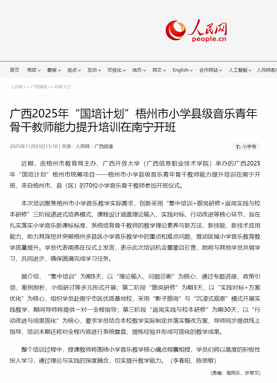 11月3日,人民网-广西频道以“广西2025年“国培计划”梧州市小学县级音乐青年骨干教师能力提升培训在南宁开班”为题,报道了由梧州市教育局主办、pg娱乐电子游戏官网入口承办的广西2025年“国培计划”梧州市统筹项目——梧州市小学县级音乐青年骨干教师能力提升培训在南宁开班,来自梧州市、县(区)的70位小学音乐骨干教师参加开班仪式的相关情况。现将报道转载如下。