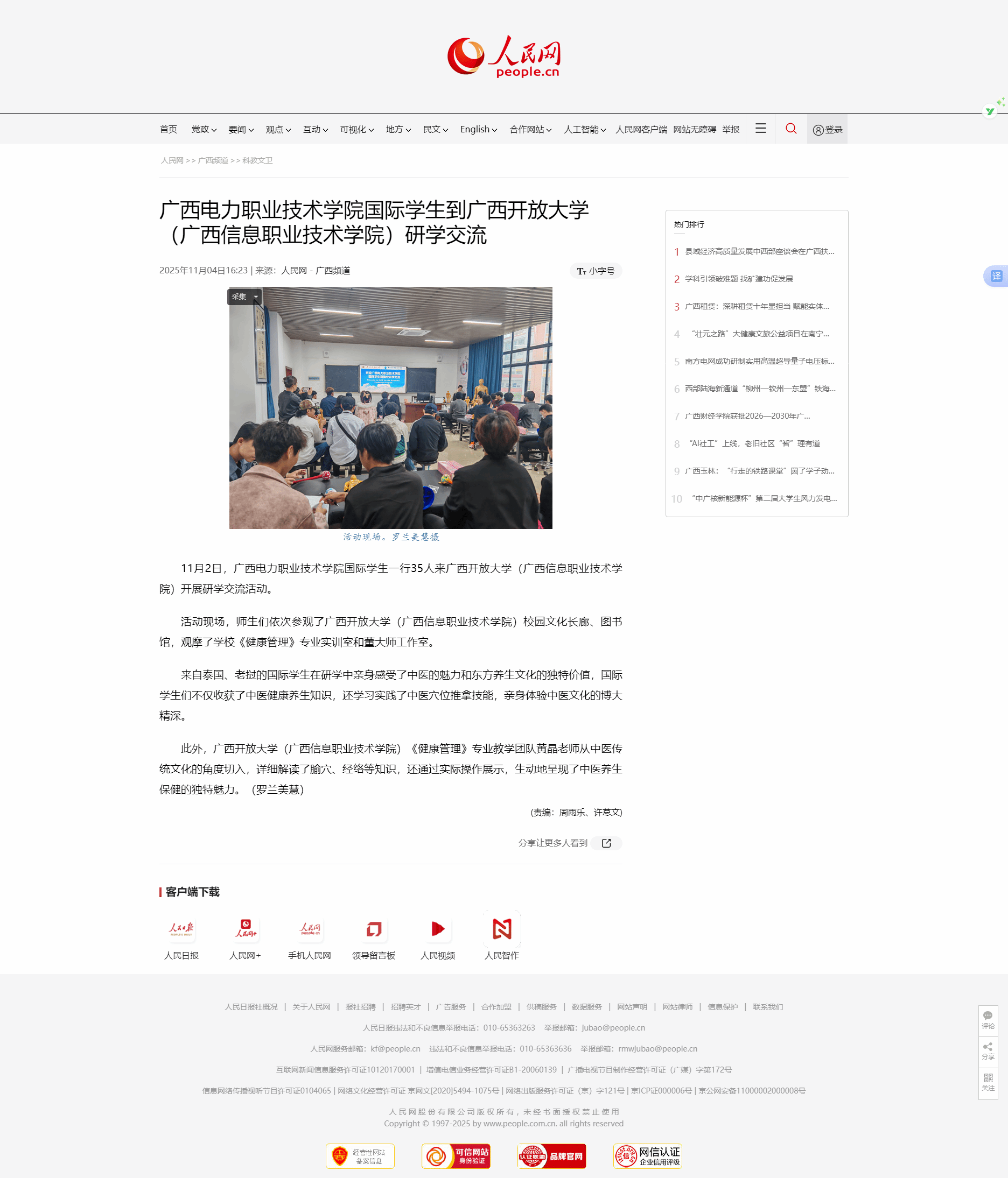 11月4日,人民网-广西频道以“广西电力职业技术学院国际学生到pg娱乐电子游戏官网入口研学交流”为题,报道了广西电力职业技术学院国际学生一行35人来pg娱乐电子游戏官网入口开展研学交流活动,亲身感受中医的魅力和东方养生文化的独特价值等的相关情况。现将报道转载如下。