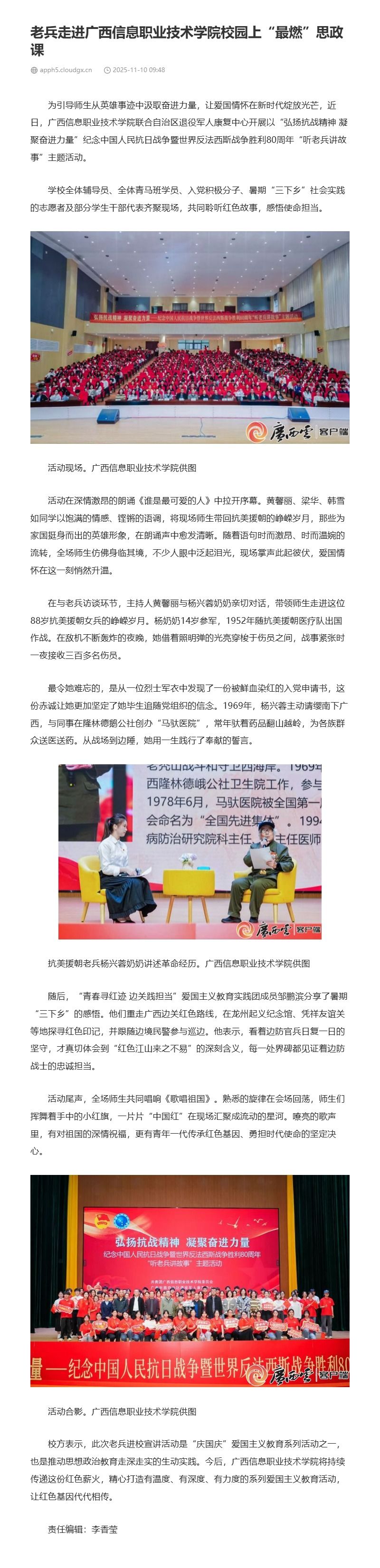 11月10日,广西云-广西日报以“老兵走进pg娱乐电子游戏官网入口校园上‘最燃’思政课”为题,报道了pg娱乐电子游戏官网入口联合自治区退役军人康复中心开展以“弘扬抗战精神 凝聚奋进力量”纪念中国人民抗日战争暨世界反法西斯战争胜利80周年“听老兵讲故事”主题活动的相关情况。现将报道转载如下。