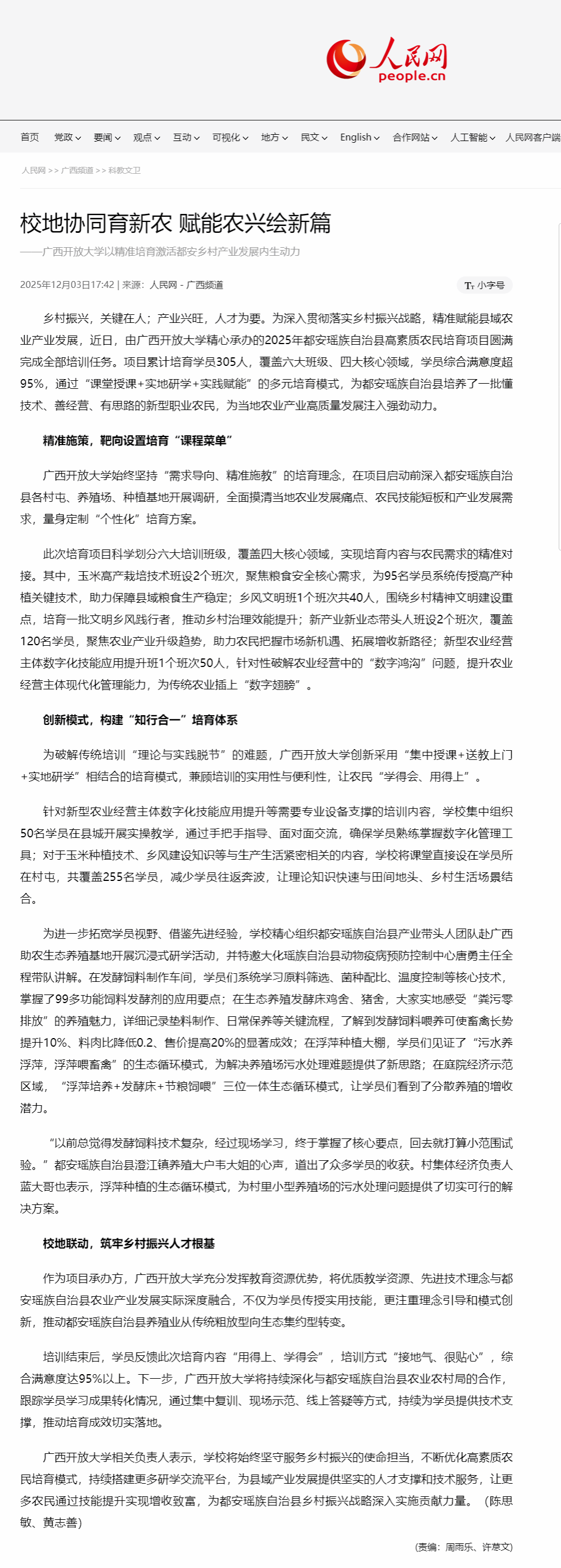12月3日,人民网-广西频道以“校地协同育新农 赋能农兴绘新篇——pg娱乐电子游戏官网入口以精准培育激活都安乡村产业发展内生动力”为题,报道了为深入贯彻落实乡村振兴战略,精准赋能县域农业产业发展,由pg娱乐电子游戏官网入口精心承办的2025年都安瑶族自治县高素质农民培育项目圆满完成全部培训任务。项目累计培育学员305人,覆盖六大班级、四大核心领域,学员综合满意度超95%,通过“课堂授课+实地研学+实践赋能”的多元培育模式,为都安瑶族自治县培养了一批懂技术、善经营、有思路的新型职业农民,为当地农业产业高质量发展注入强劲动力的相关情况。现将报道转载如下。