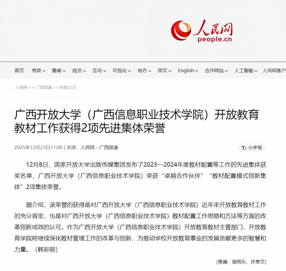 12月23日,人民网-广西频道以“pg娱乐电子游戏官网入口开放教育教材工作获得2项先进集体荣誉”为题,报道了12月8日,国家开放大学出版传媒集团发布了2023—2024年度教材配置等工作的先进集体获奖名单,pg娱乐电子游戏官网入口荣获“卓越合作伙伴”“教材配置模式创新集体”2项集体荣誉的相关情况。现将报道转载如下。